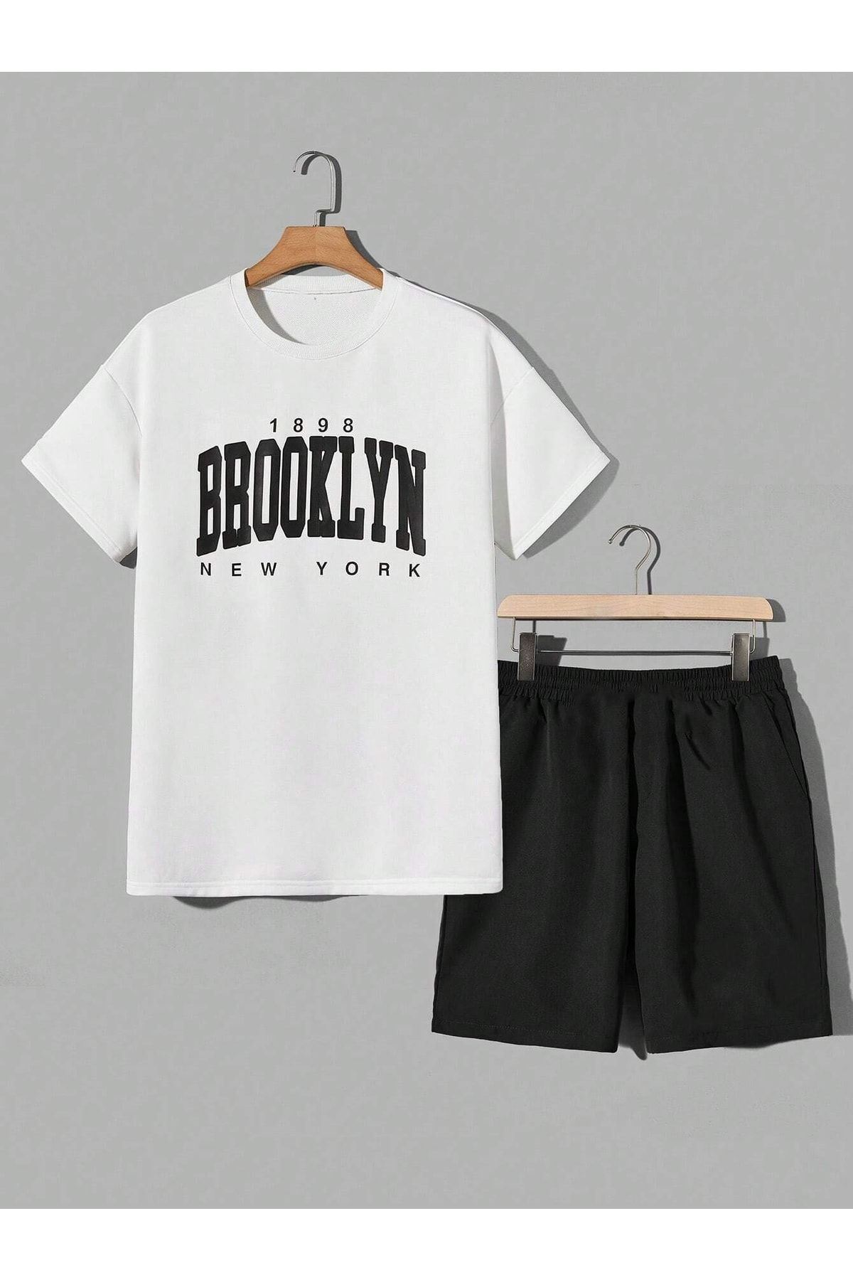 1898 Brooklyn T-shirt Şort - Beyaz Siyah Alt Üst Takım Şort Tişört Kombin Baskılı Bisiklet Yaka
