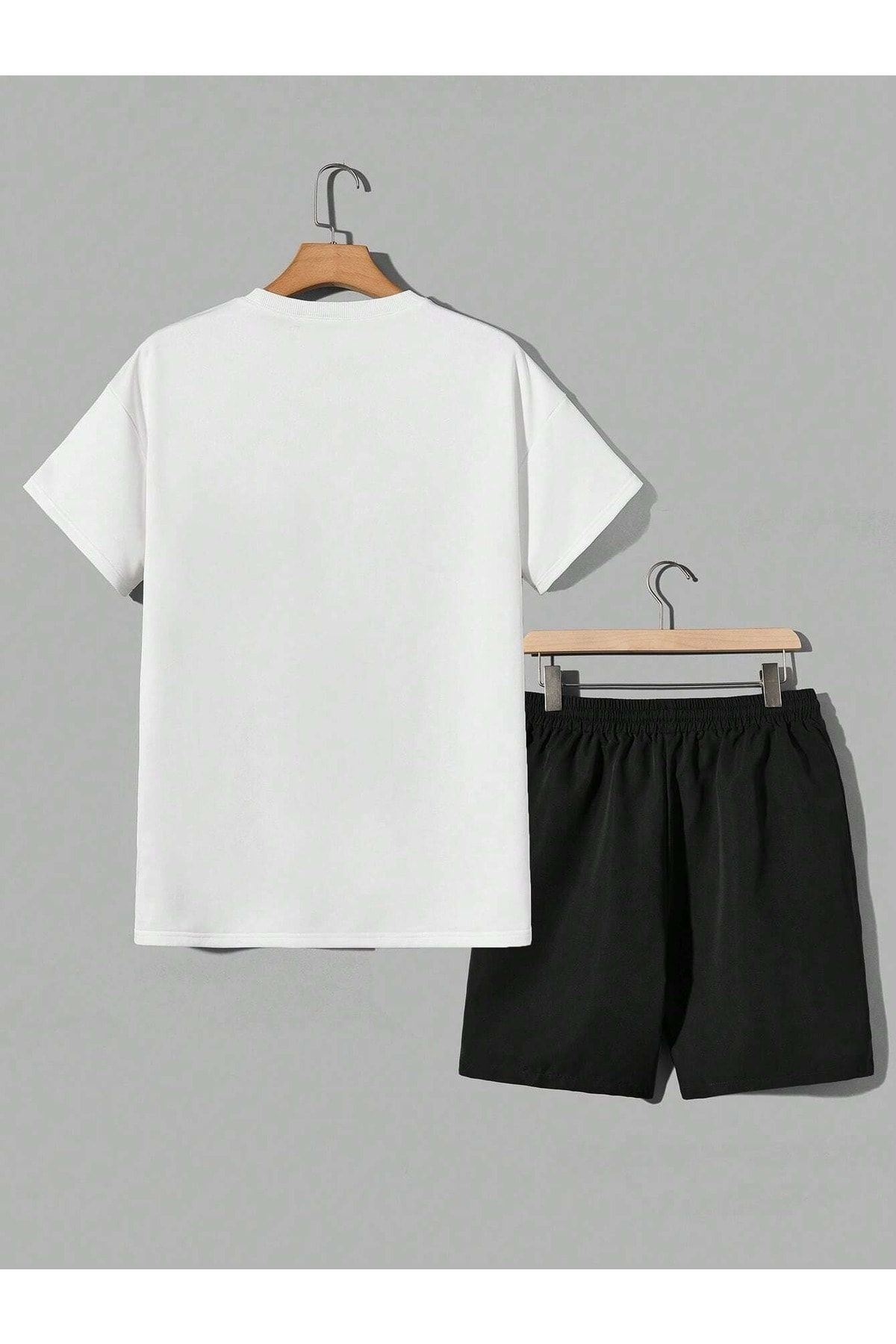 1898 Brooklyn T-Shirt Şort - Beyaz Siyah Alt Üst Takım Şort Tişört Kombin Baskılı Bisiklet Yaka