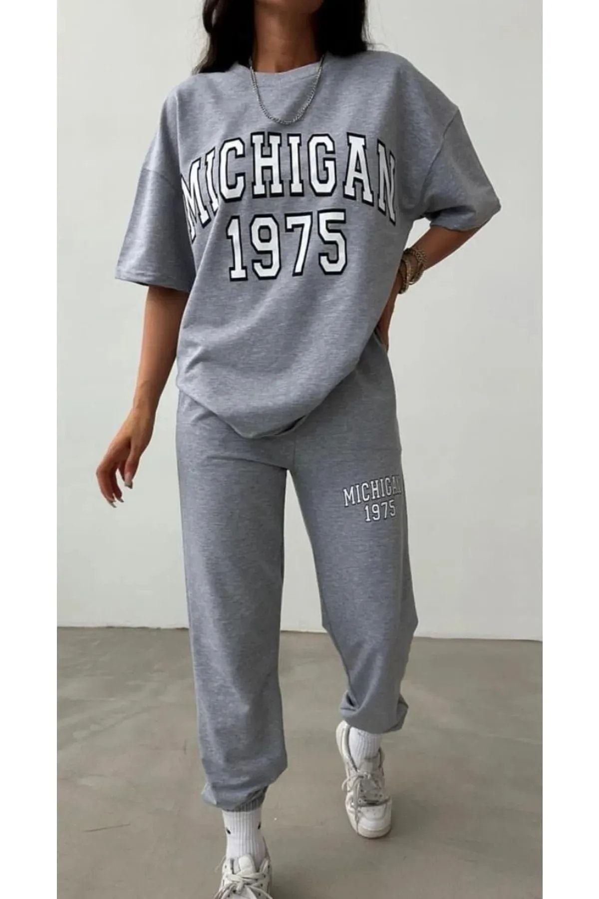 1975 T-Shirt Eşofman Altı Jogger- Gri Baskı Alt Üst Eşofman Takımı Oversize Bisiklet Yaka