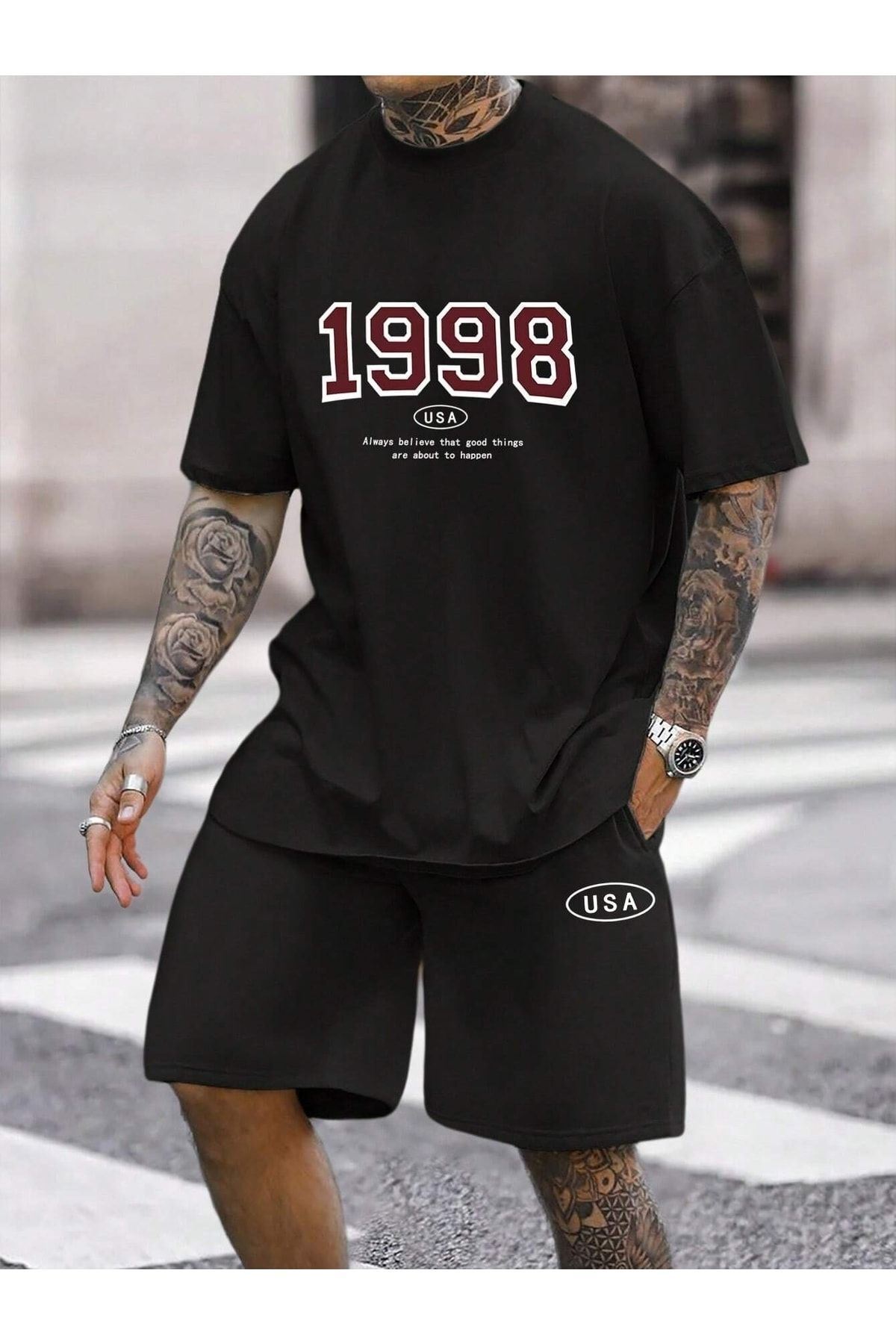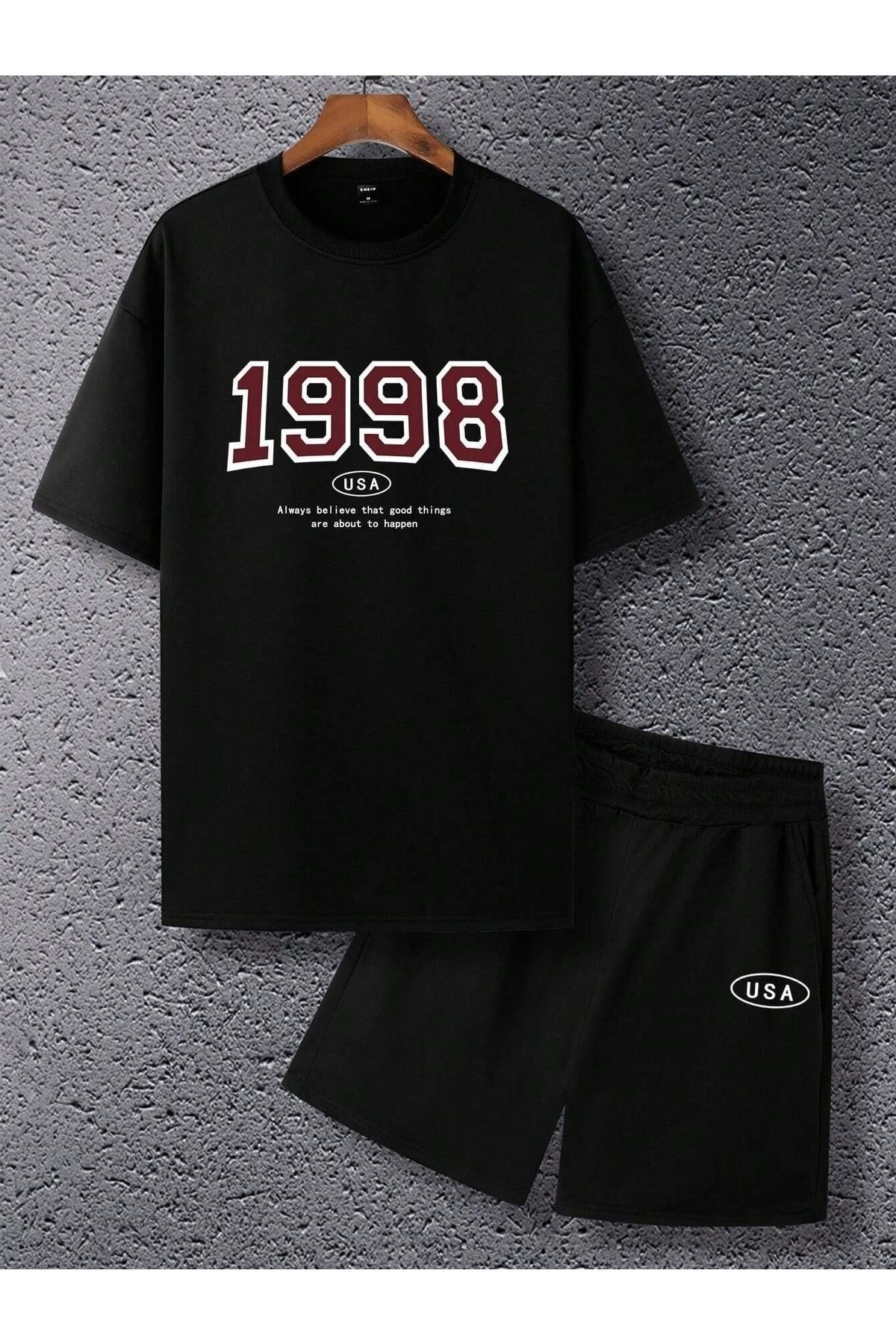 1998 Usa T-shirt Şort - Siyah Alt Üst Kombin Şort Tişört Takım Baskılı Oversize Bisiklet Yaka