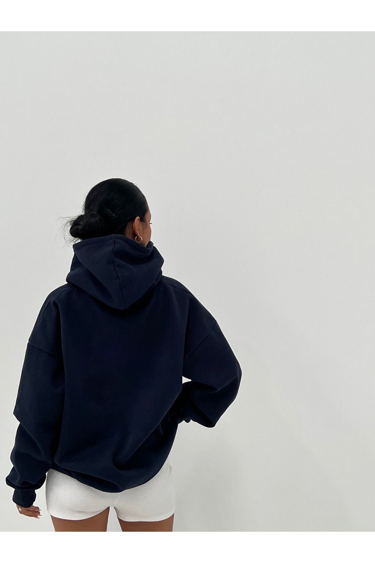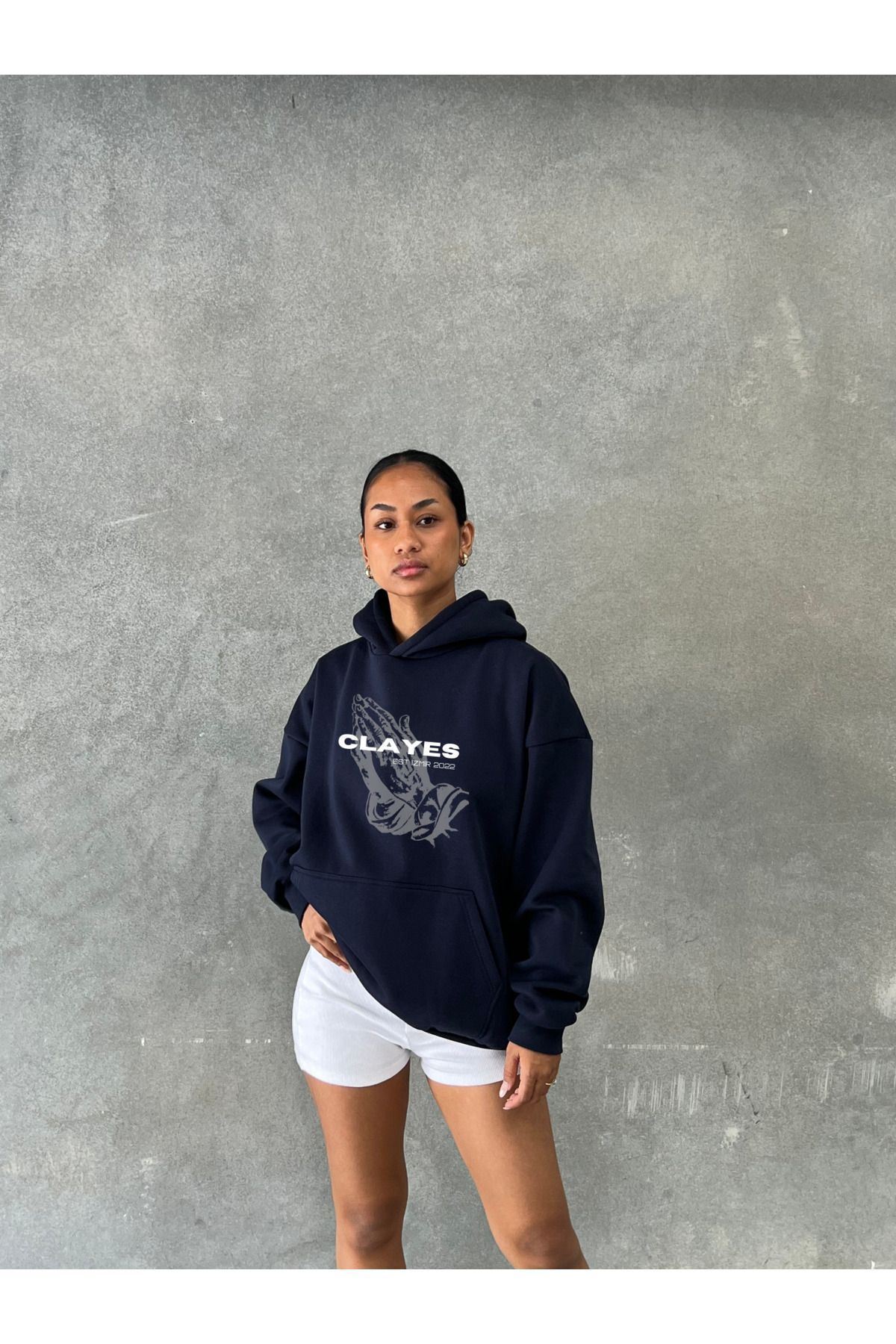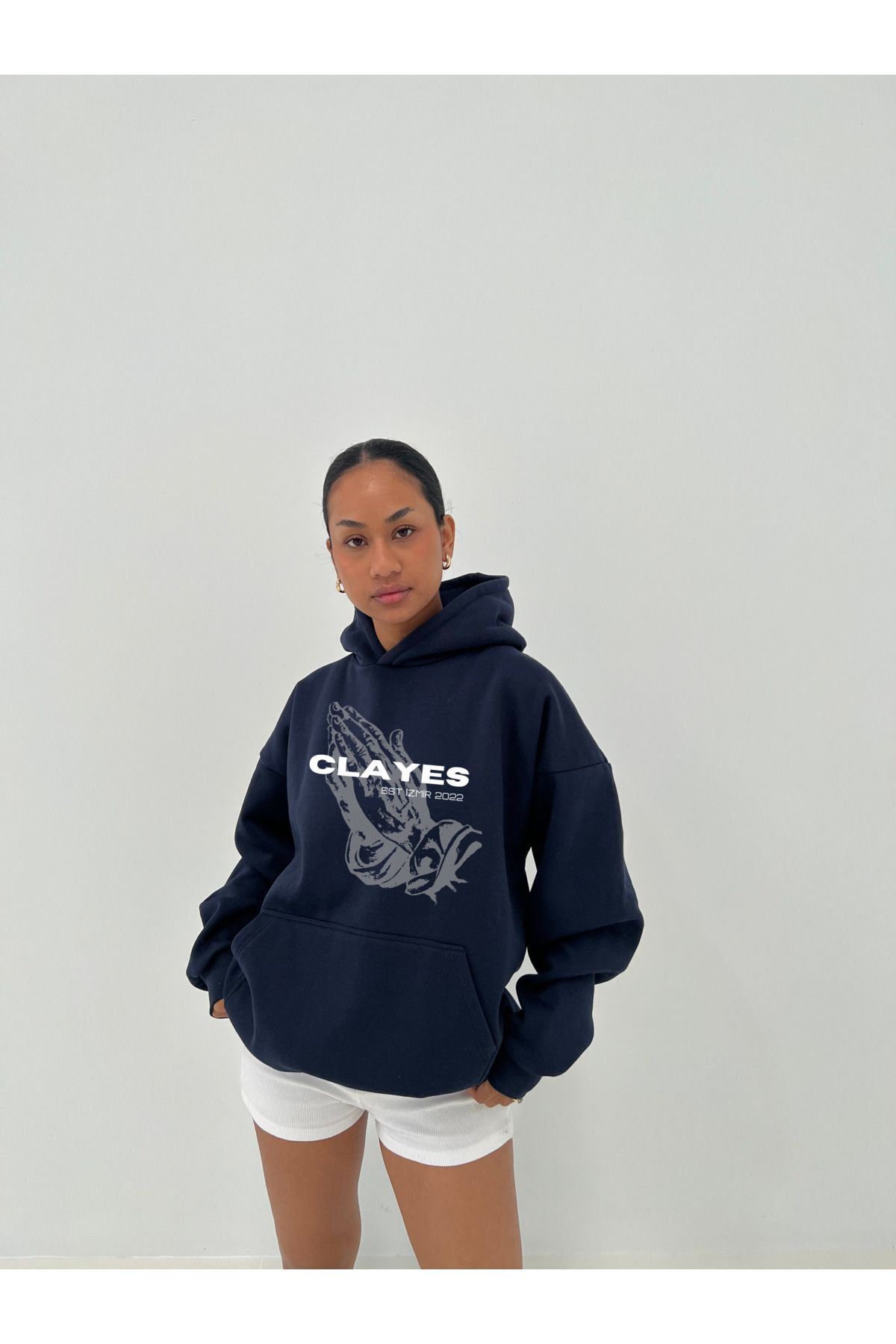 2022 Pray Hand %100 Pamuk Sweatshirt - Lacivert Baskılı Oversize Kışlık İçi Polarlı Kapüşonlu