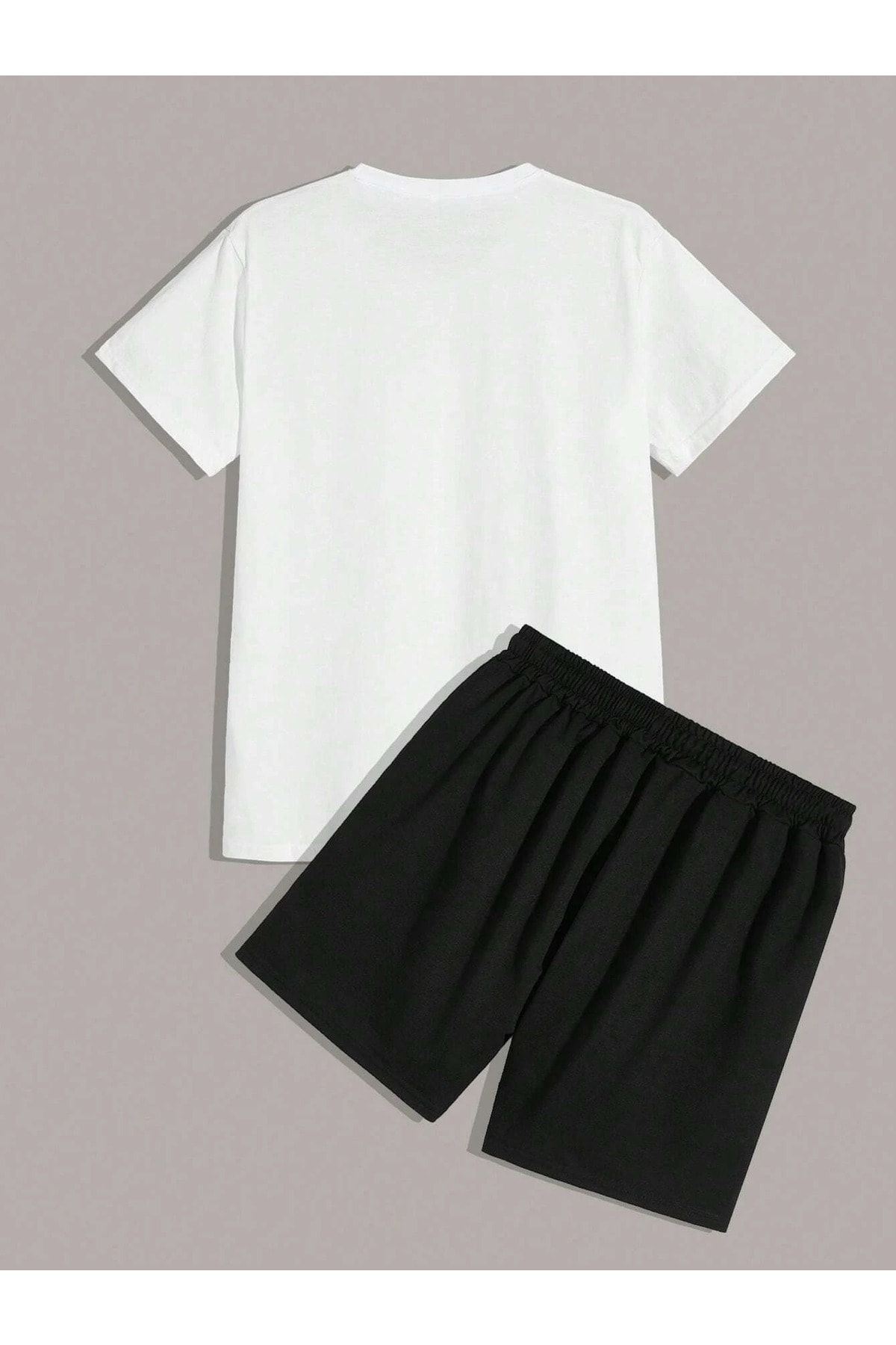 23 Sayılı T-Shirt Şort - Beyaz Siyah Alt Üst Takım Şort Tişört Kombin Baskılı Bisiklet Yaka
