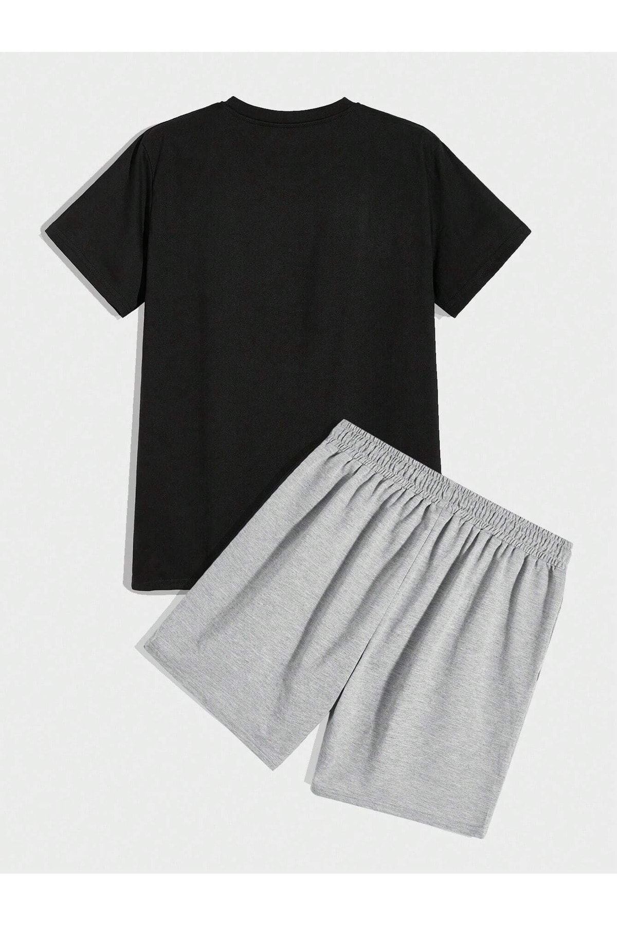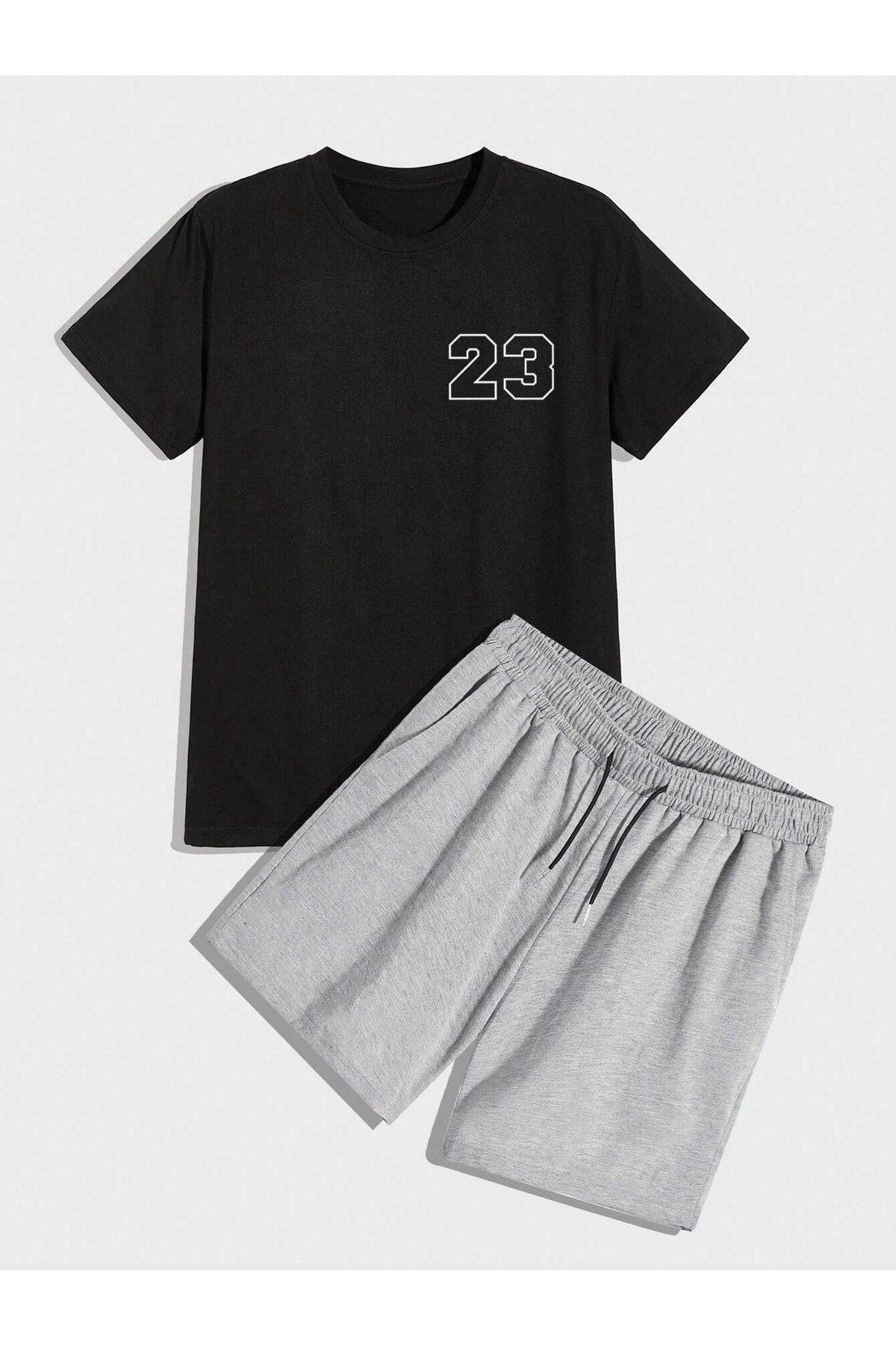 23 Sayılı T-Shirt Şort - Siyah Gri Alt Üst Takım Şort Tişört Kombin Baskılı Bisiklet Yaka