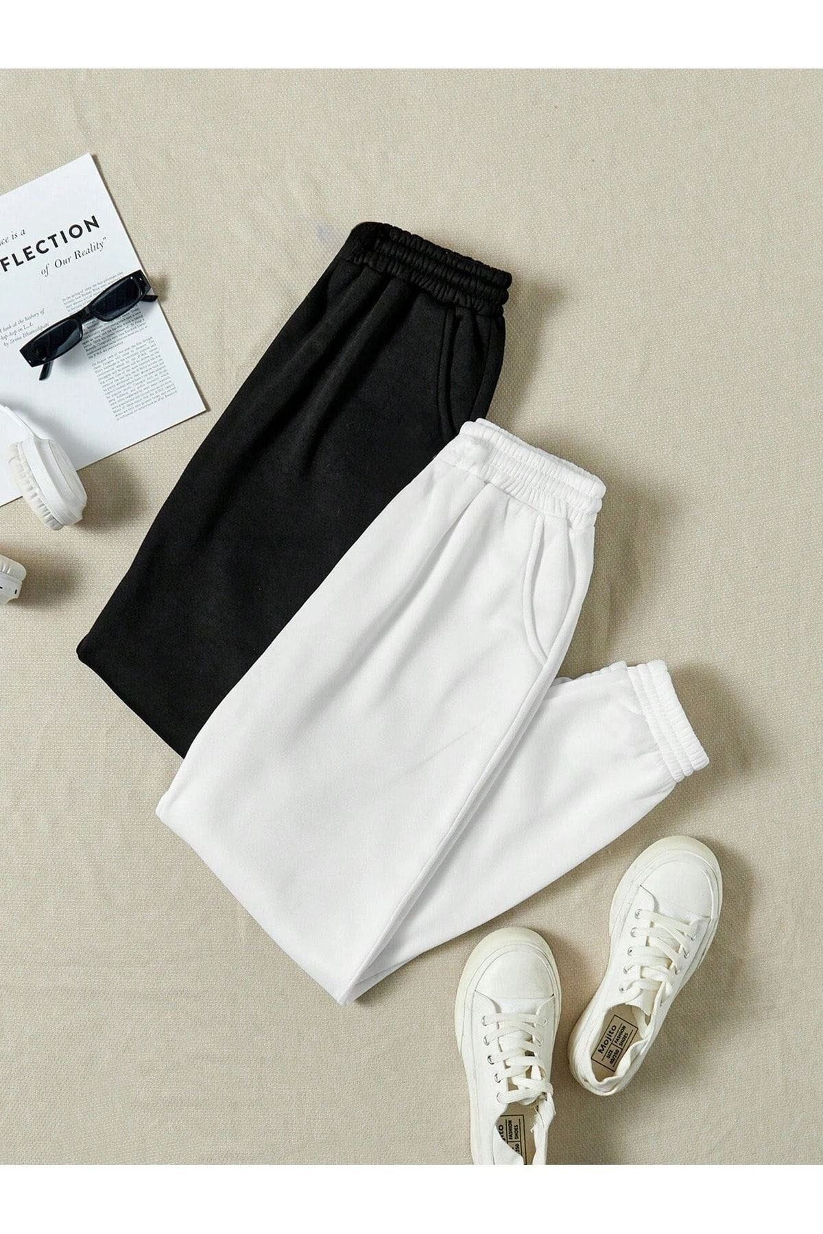 2'li Basic Düz Eşofman Altı Jogger - Siyah Ve Beyaz Lastik Paça Yüksek Bel