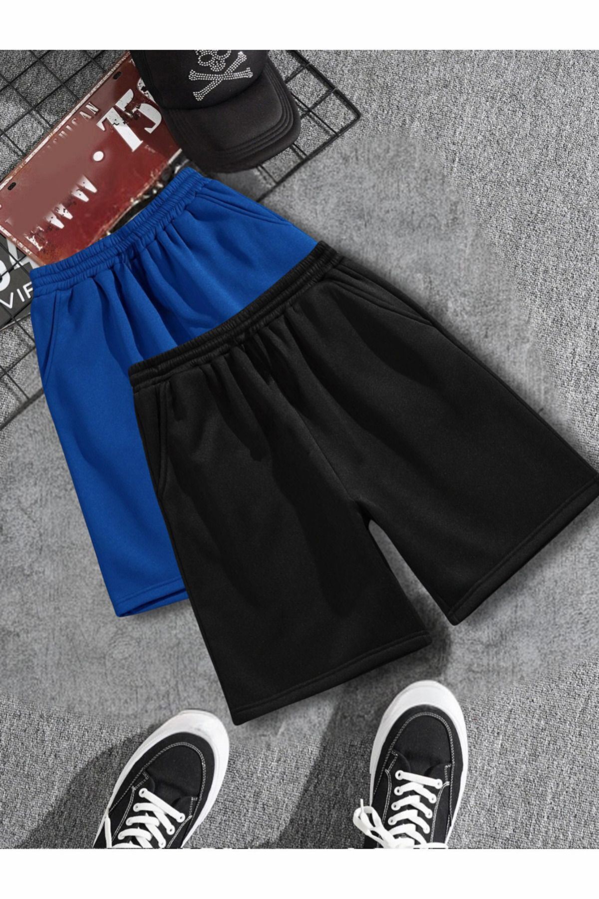 2'li Düz Renk Penye Şort - Saks Mavi Siyah Baskısız Kısa Kordonsuz