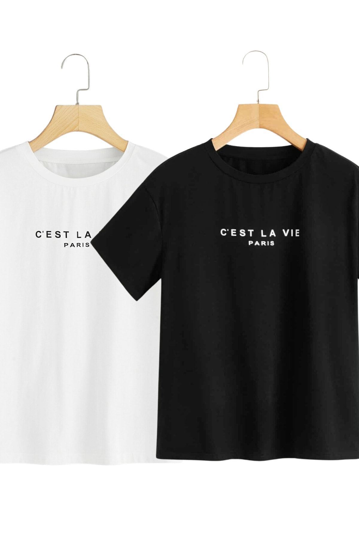 2'li Paket Cest La Vie Paris T-shirt - Siyah Beyaz Çift Baskılı Oversize Bisiklet Yaka