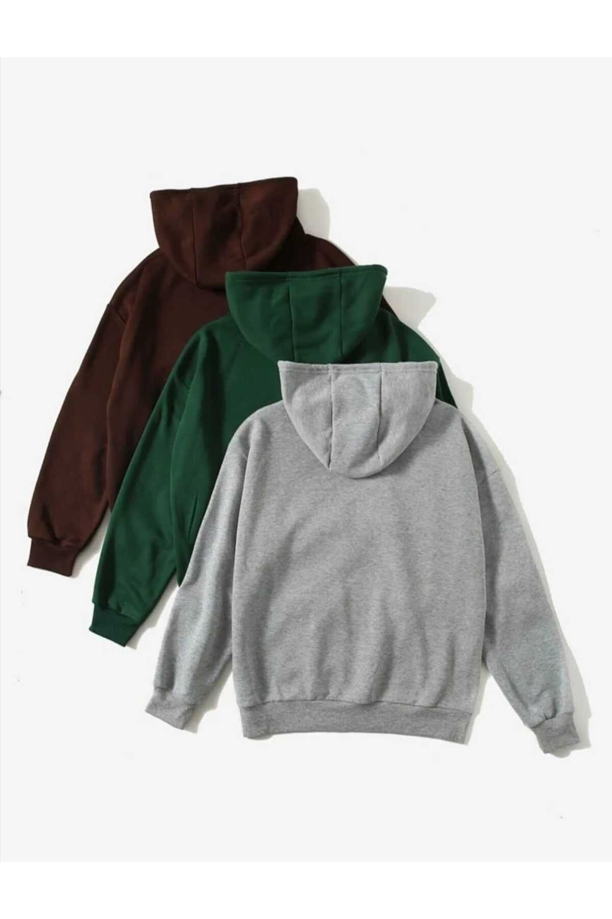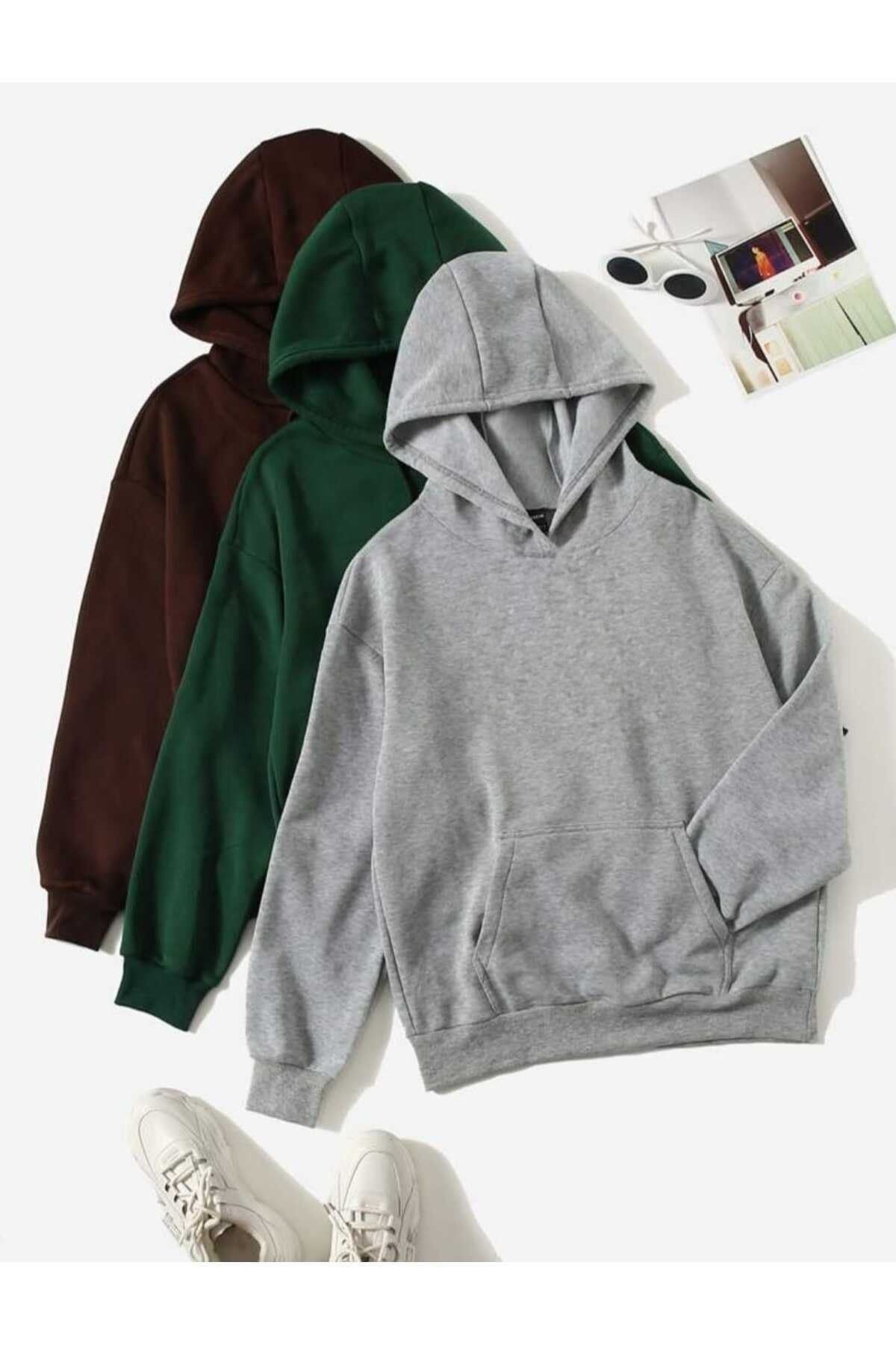 3'Lü Düz Basic Kalın Kışlık Sweatshirt - Kahverengi Nefti Yeşil Gri Oversize Kapüşonlu