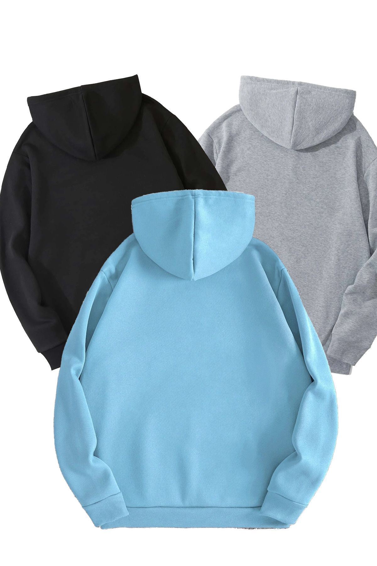 3'Lü Düz Basic Kalın Kışlık Sweatshirt - Siyah Gri Bebe Mavisi Oversize Kapüşonlu