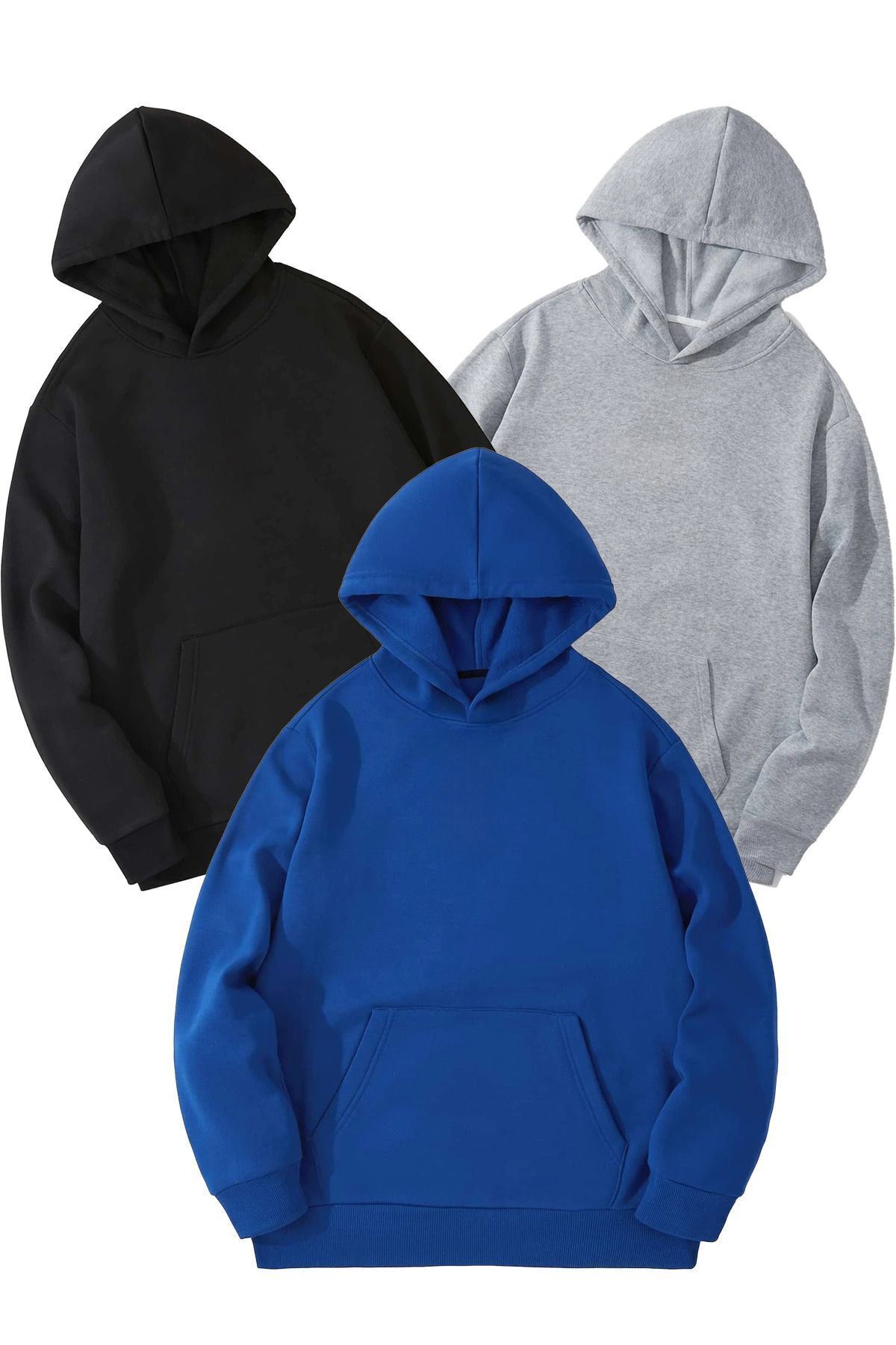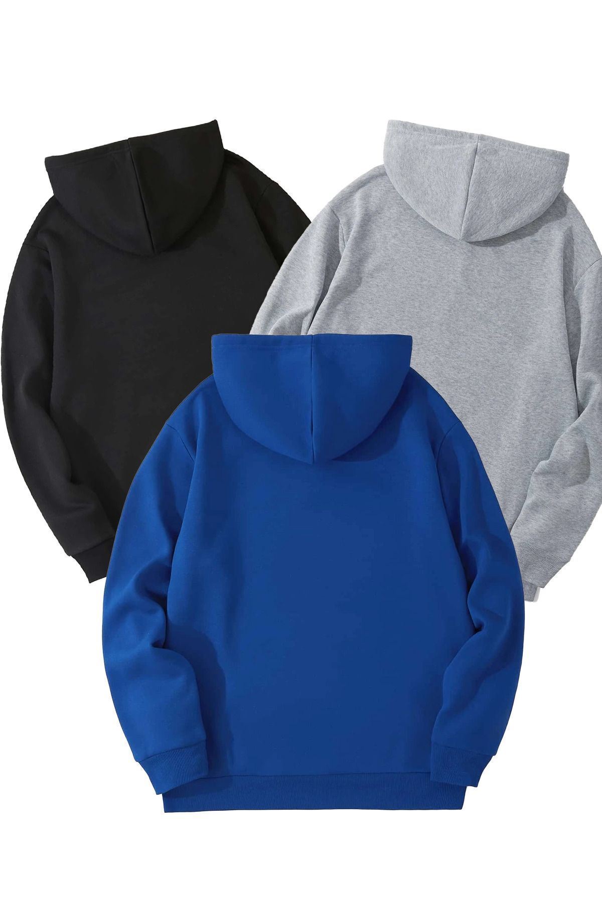 3'Lü Düz Basic Kalın Kışlık Sweatshirt - Siyah Gri Sax Mavi Oversize Kapüşonlu