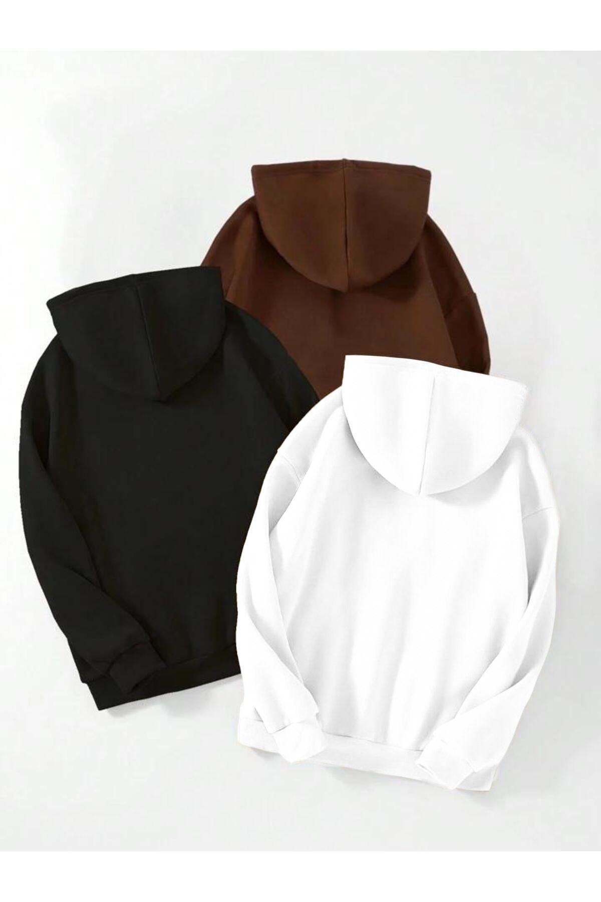 3'Lü Düz Basic Kalın Kışlık Sweatshirt - Siyah Kahverengi Beyaz Oversize Kapüşonlu