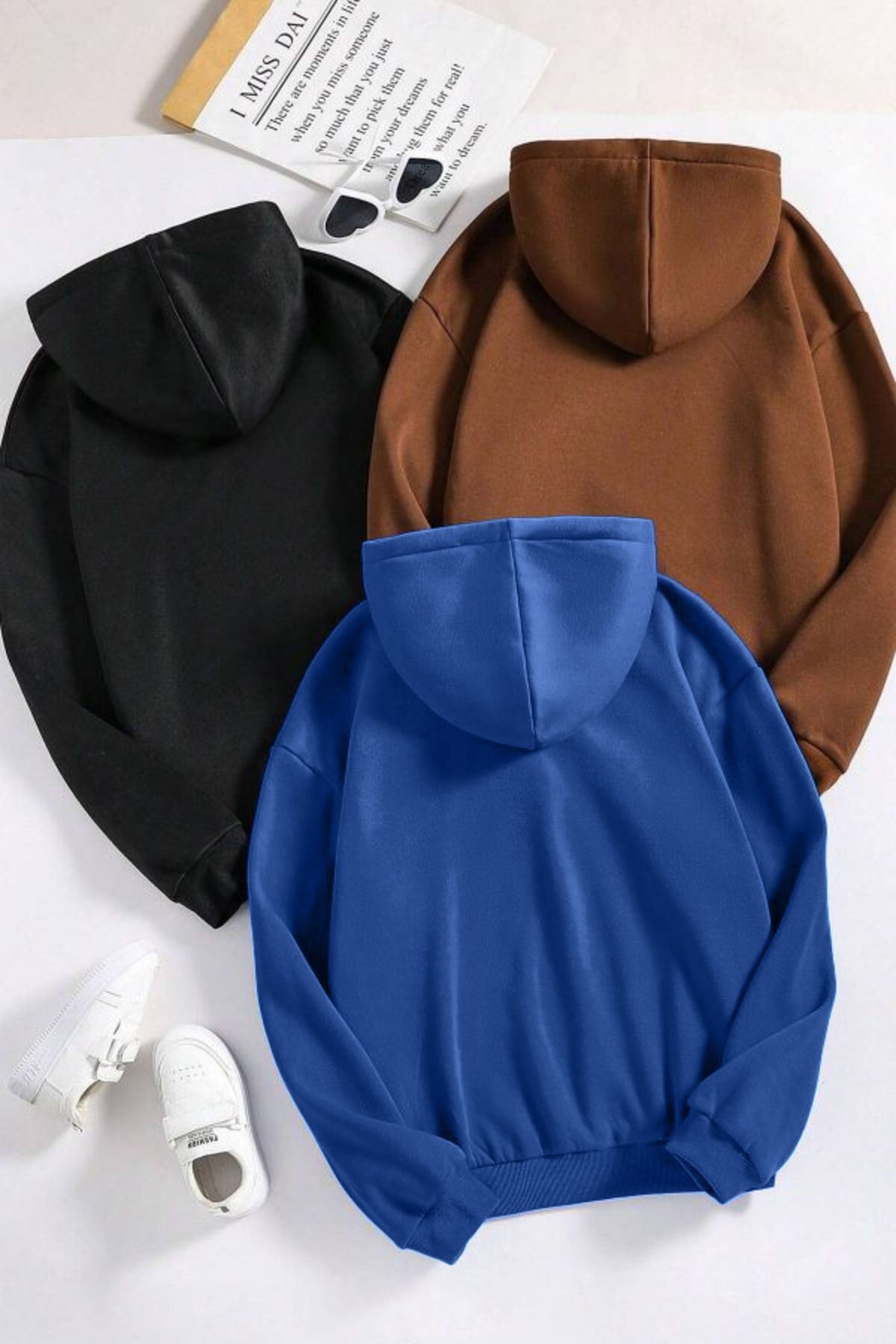 3'Lü Düz Basic Kalın Kışlık Sweatshirt - Siyah Kahverengi Sax Mavi Oversize Kapüşonlu