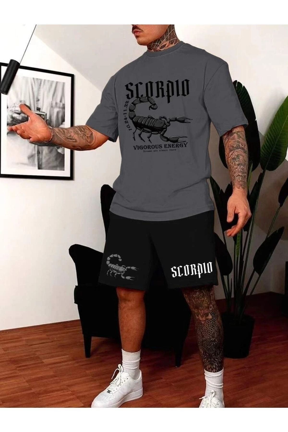 Akrep Siyah Şort Füme Tişört Takım - Baskılı Oversize Bisiklet Yaka