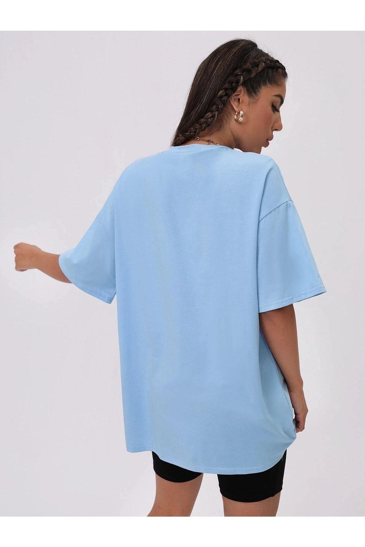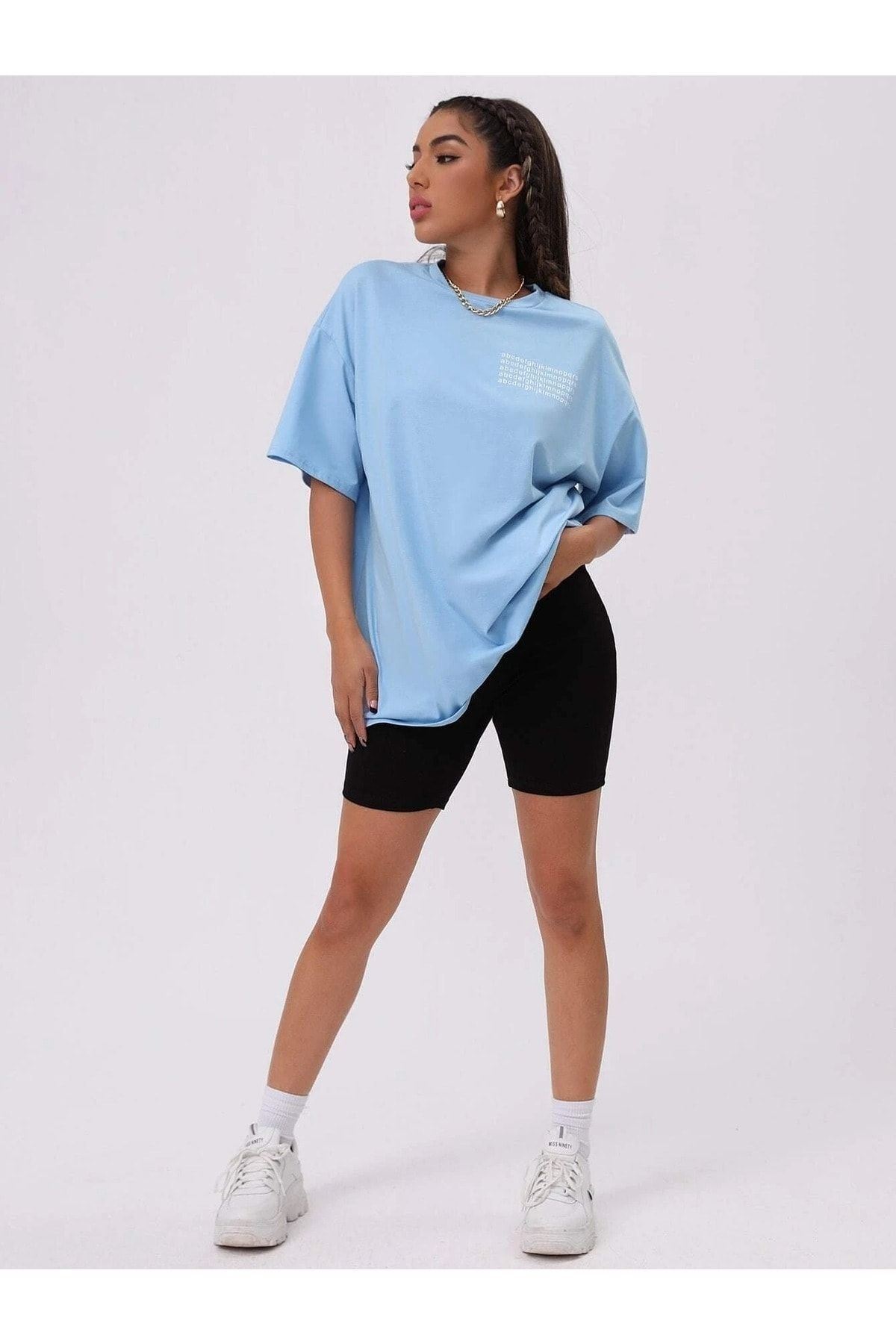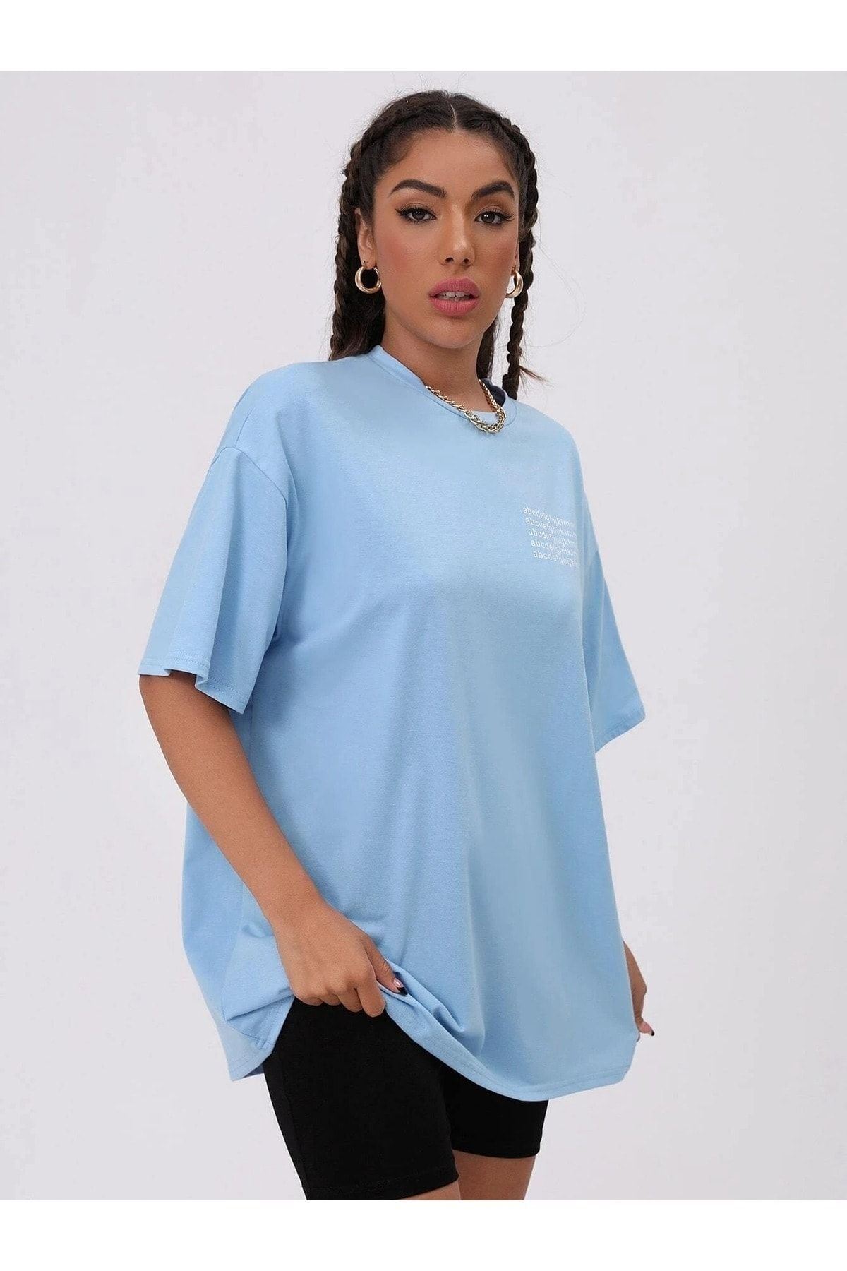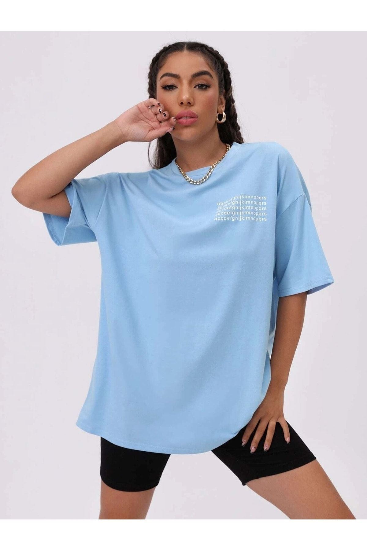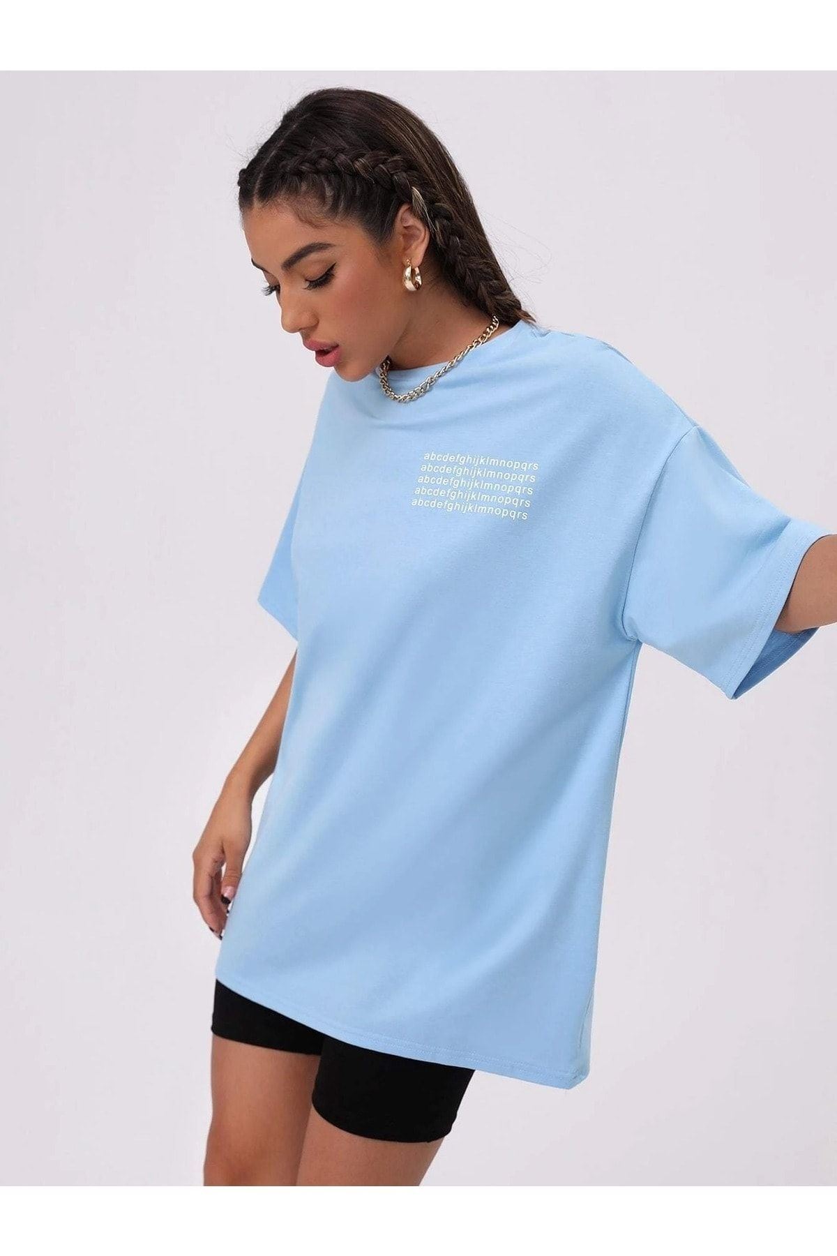 Alfabe T-Shirt - Bebe Mavisi Baskılı Oversize Bisiklet Yaka Kısa Kol