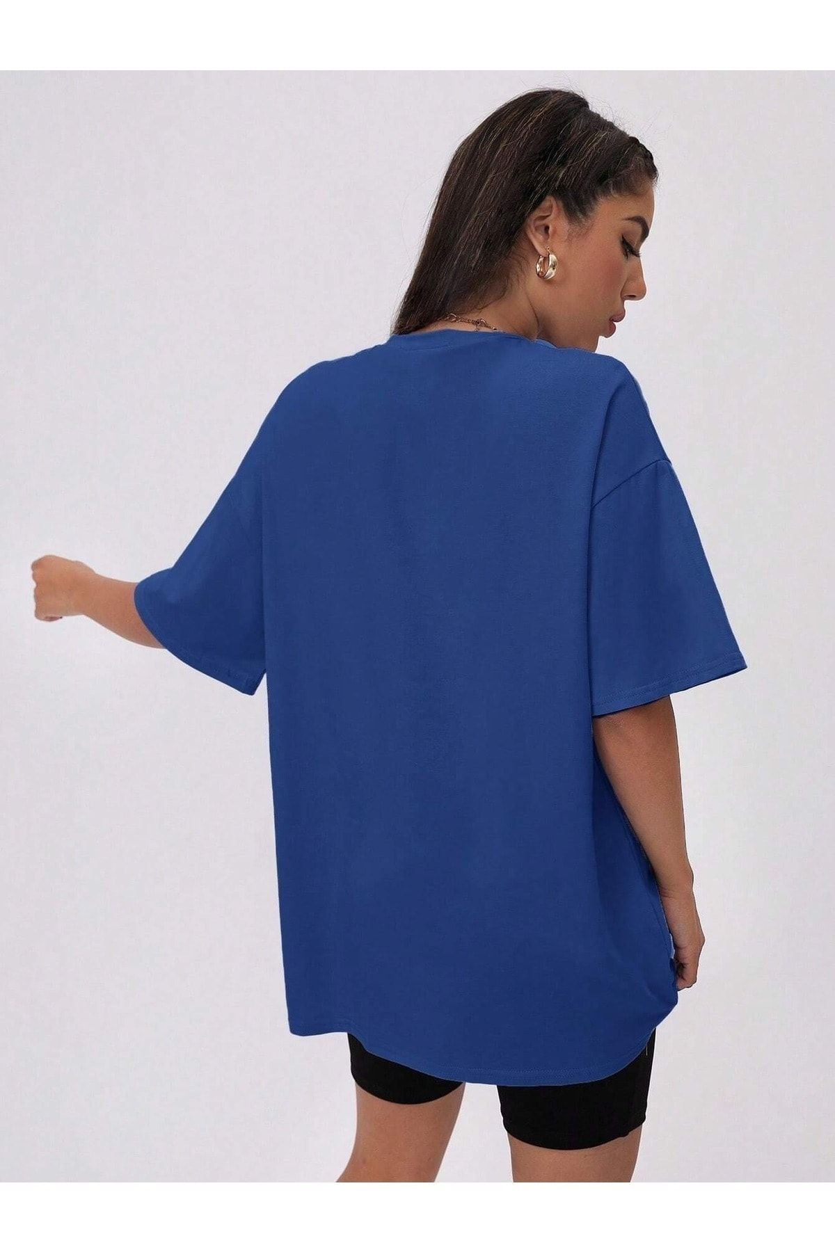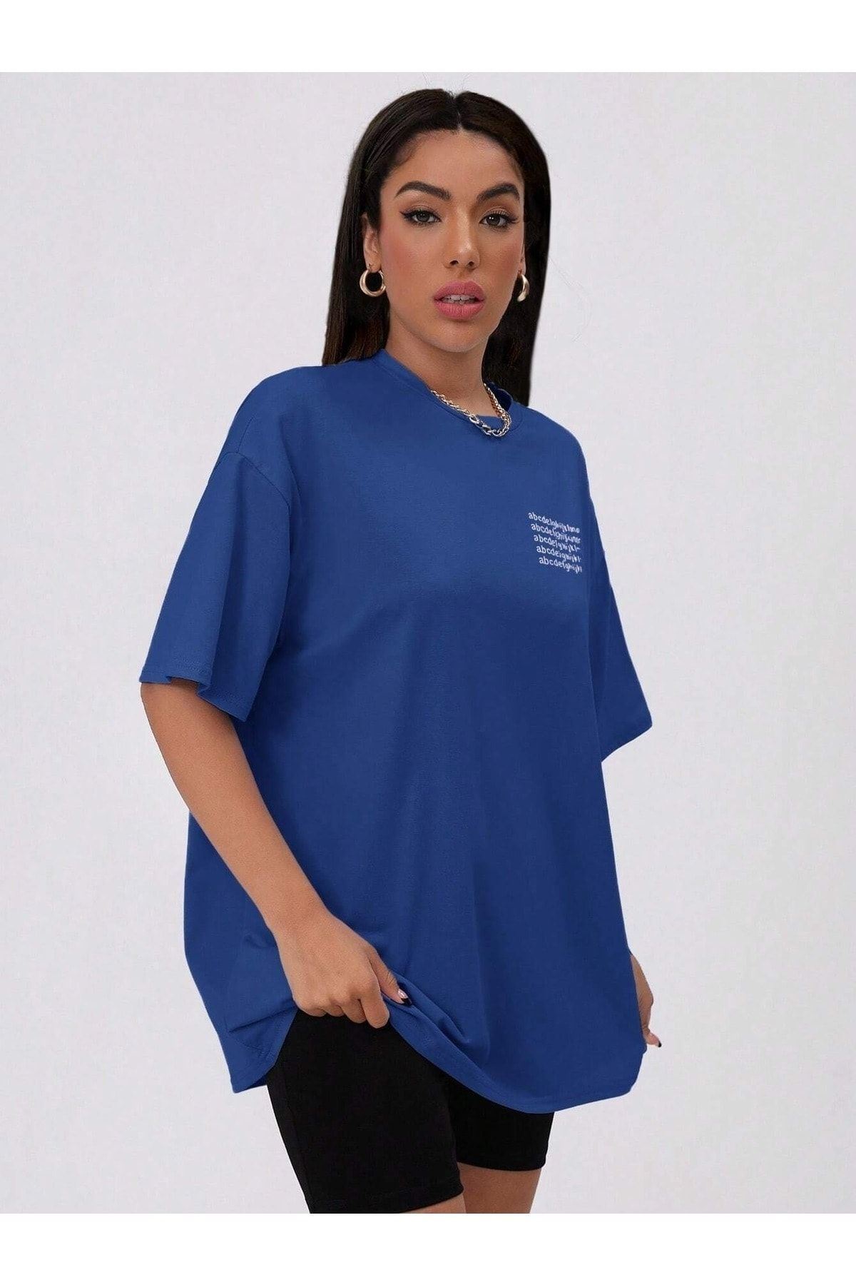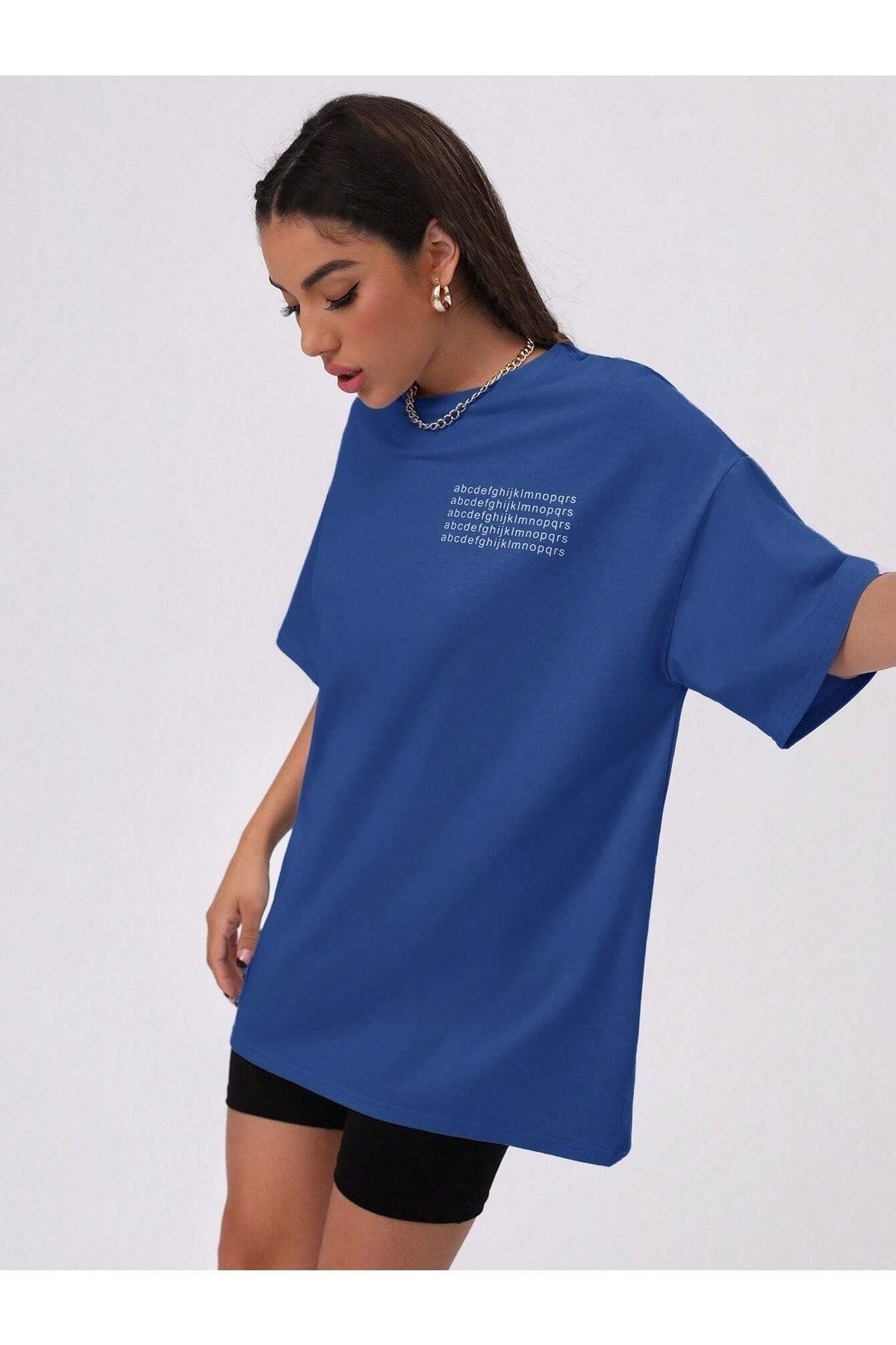 Alfabe T-Shirt - Saks Mavisi Baskılı Oversize Bisiklet Yaka Kısa Kol