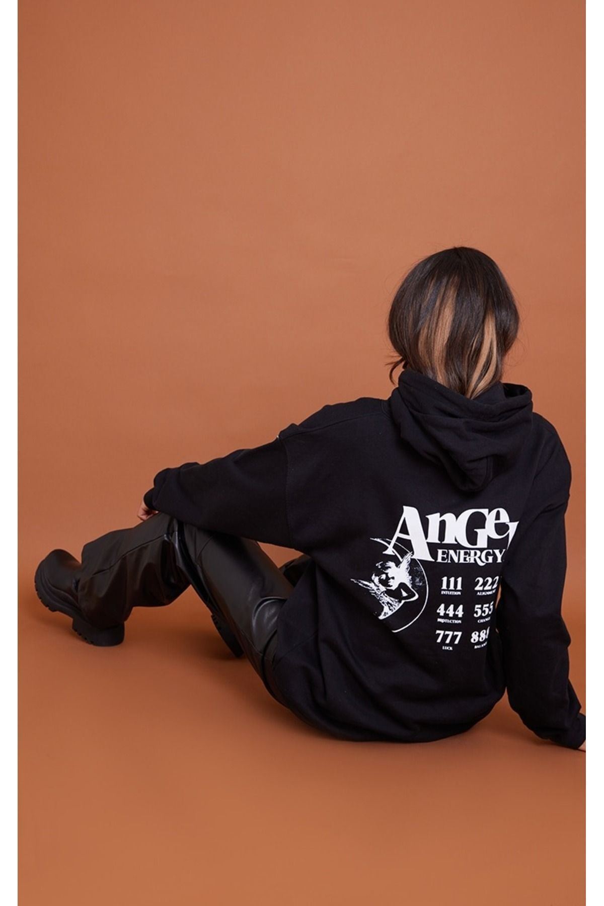 Angel Energy Sweatshirt - Siyah Baskılı Oversize Kapüşonlu