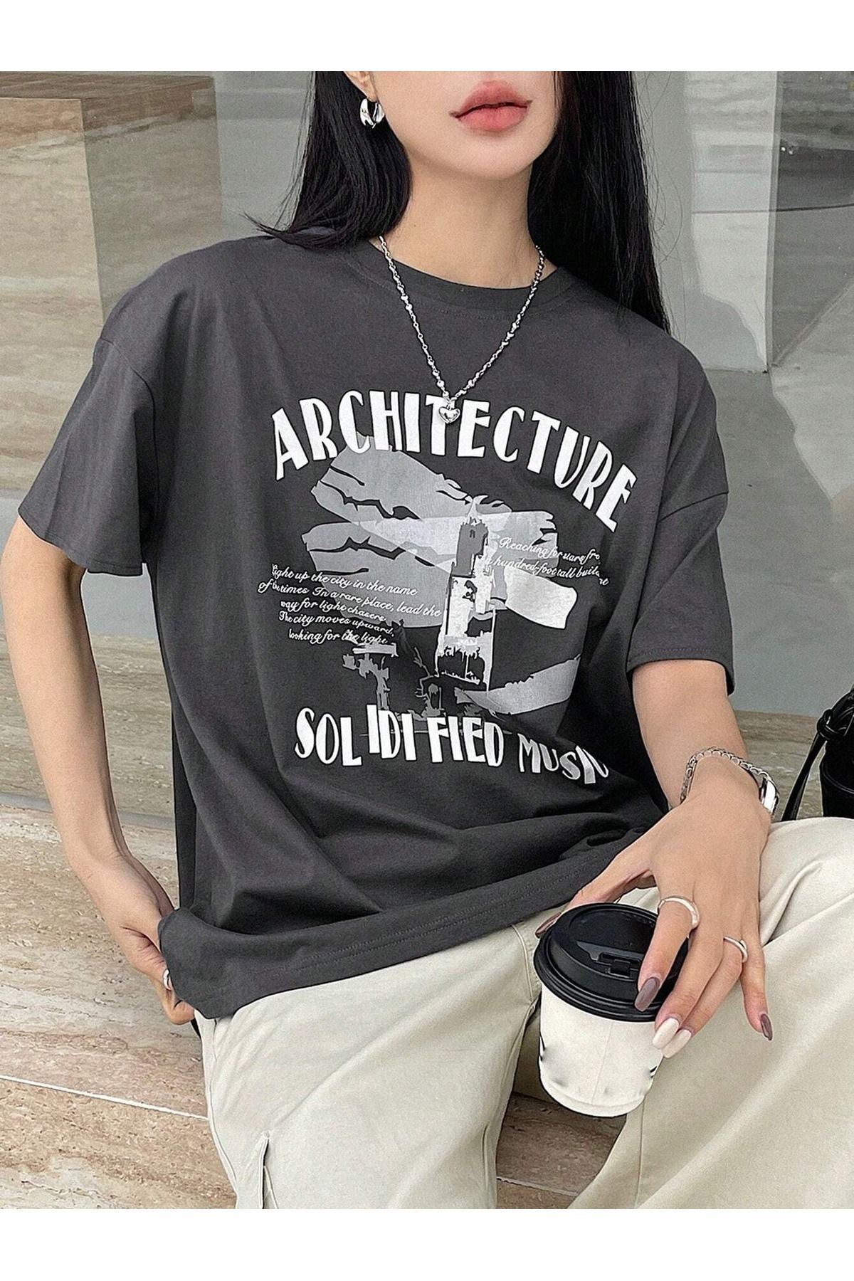 Architecture Süprem T-Shirt - Füme Baskılı Oversize Bisiklet Yaka Kısa Kol Tişört