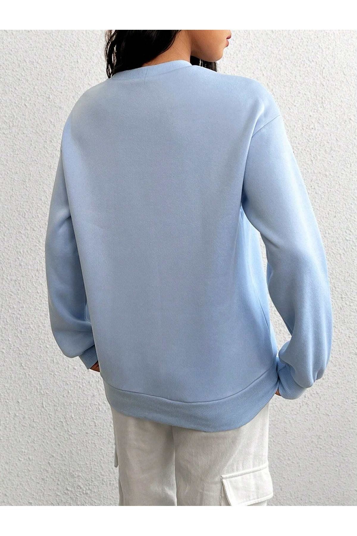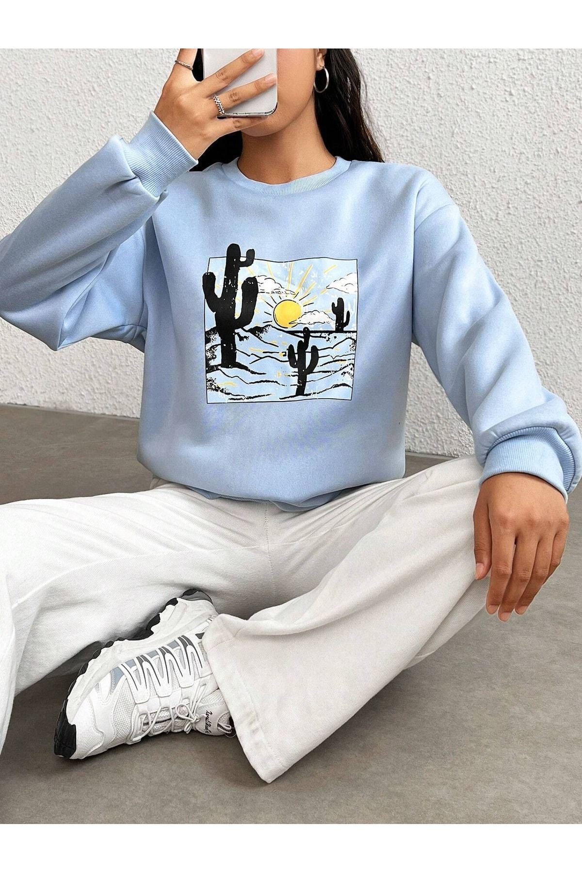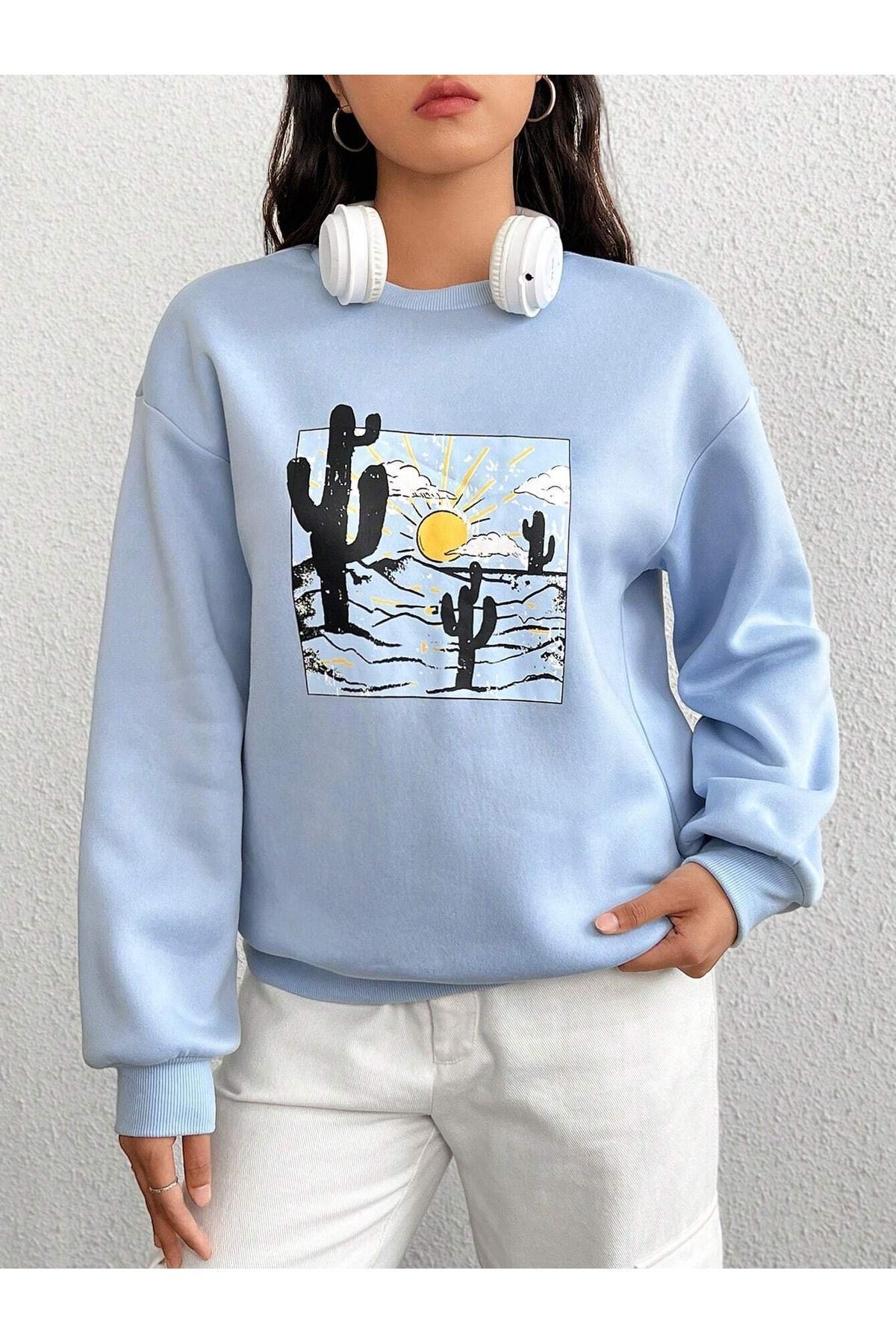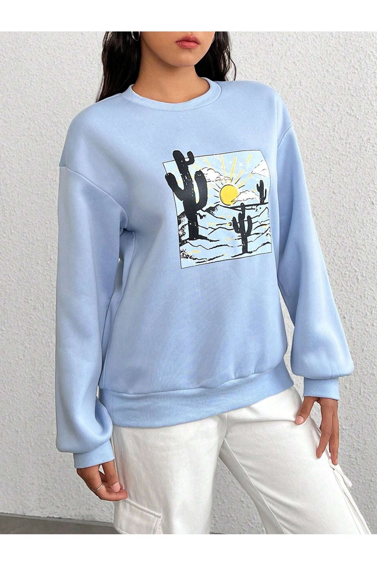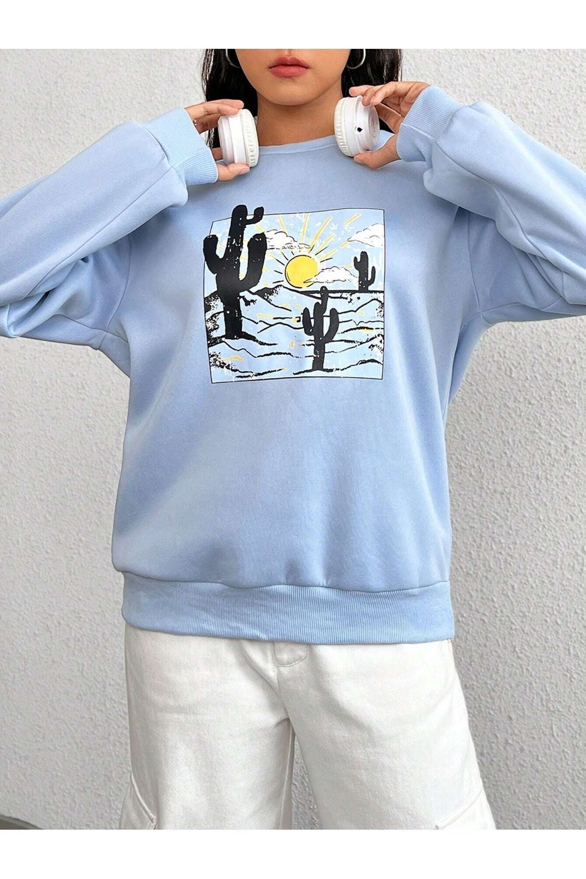 Arizona Kaktüs Sweatshirt - Bebe Mavisi Baskılı Oversize Bisiklet Yaka