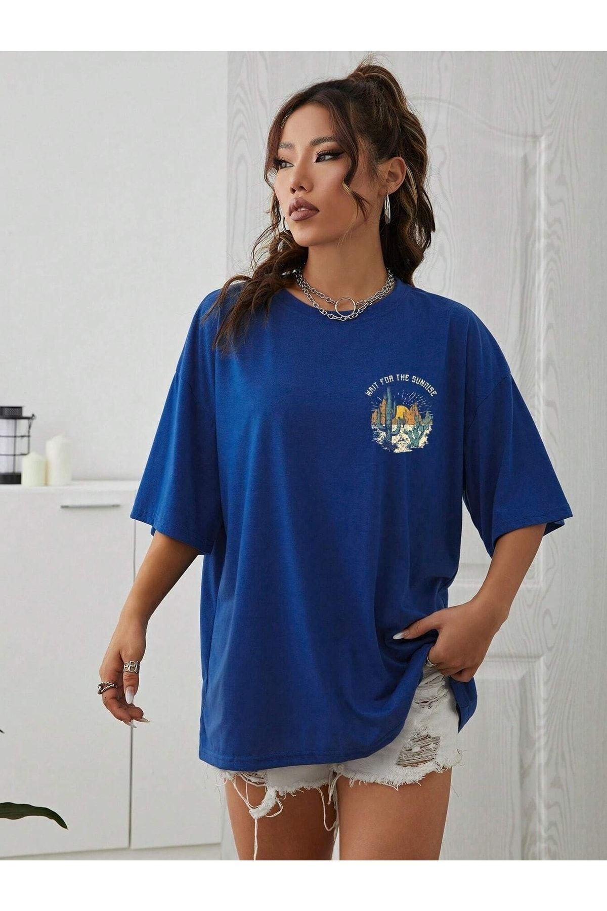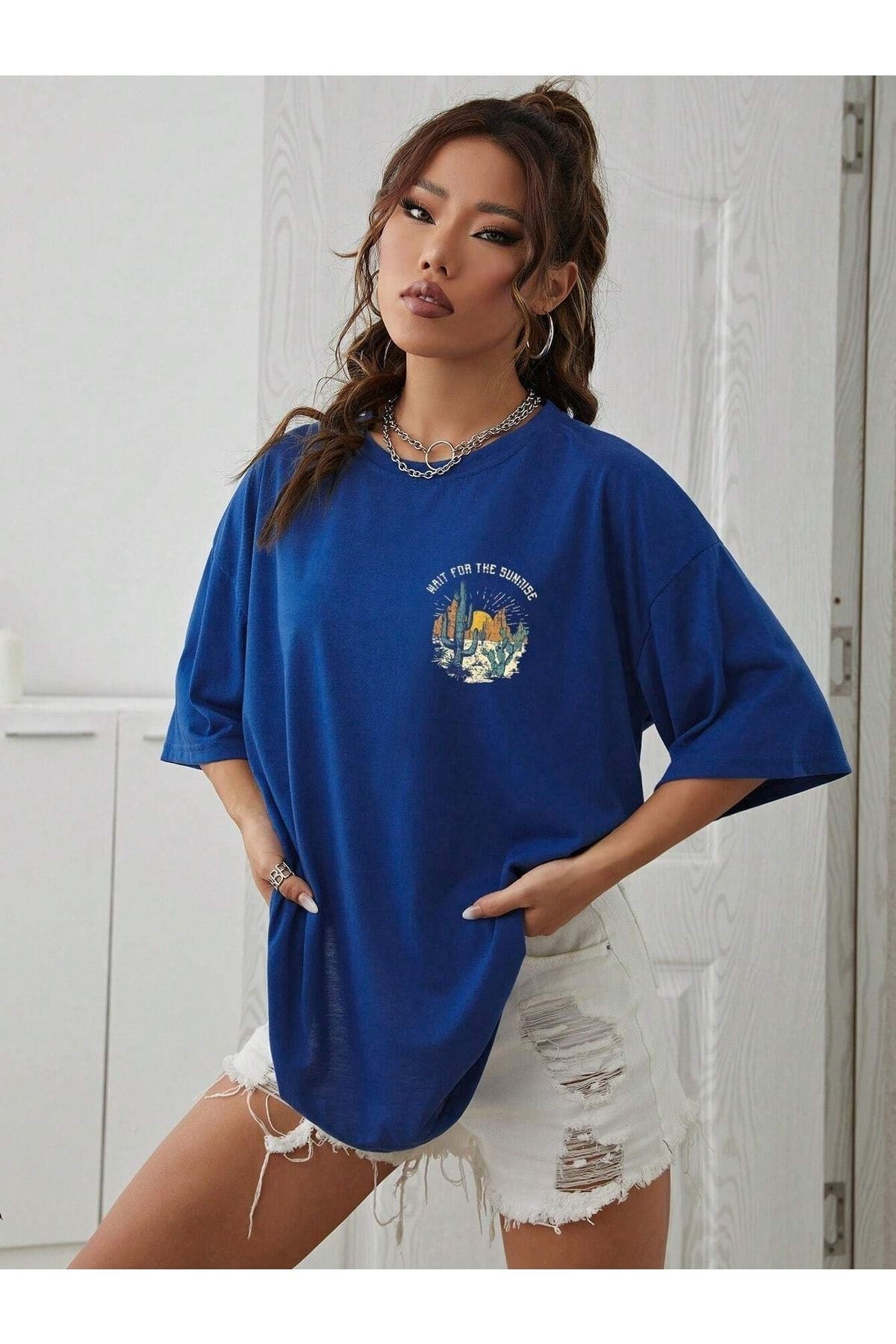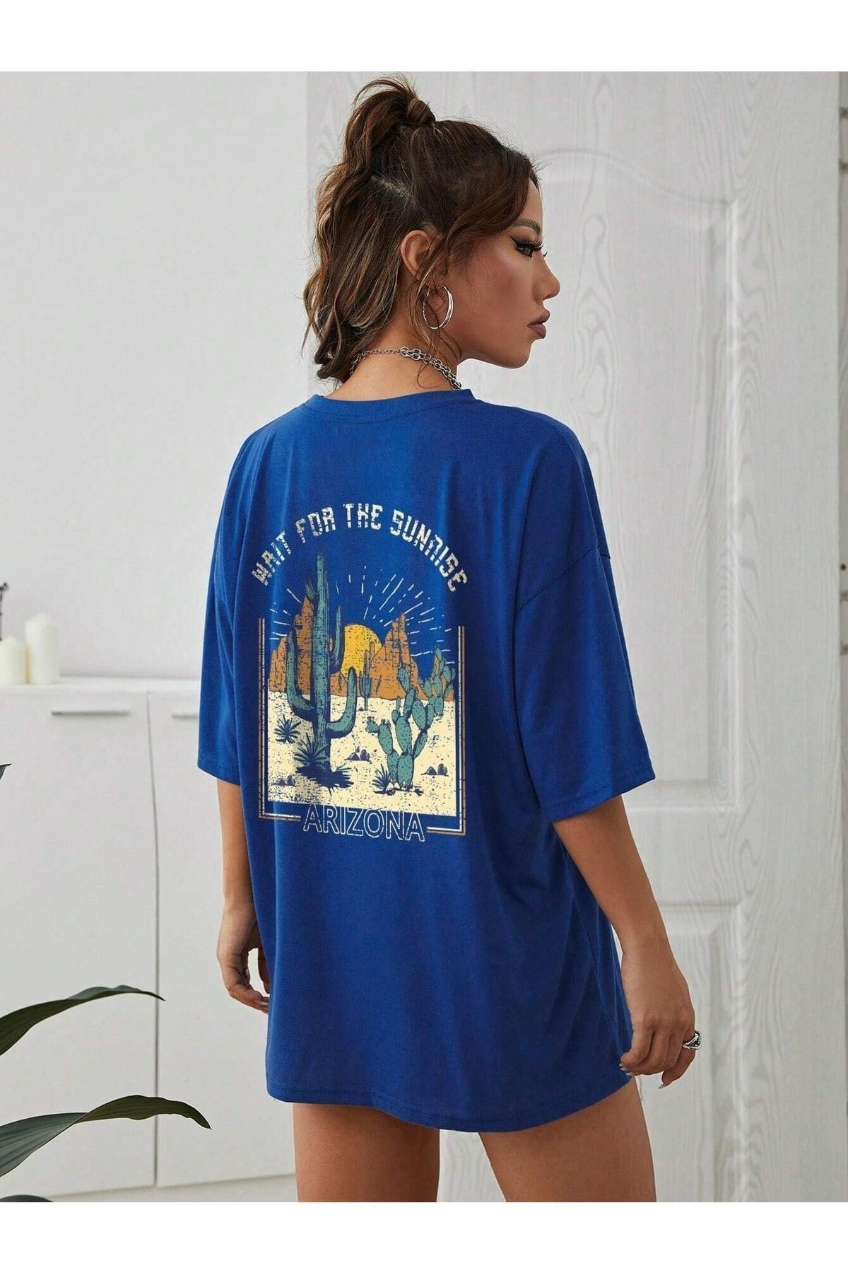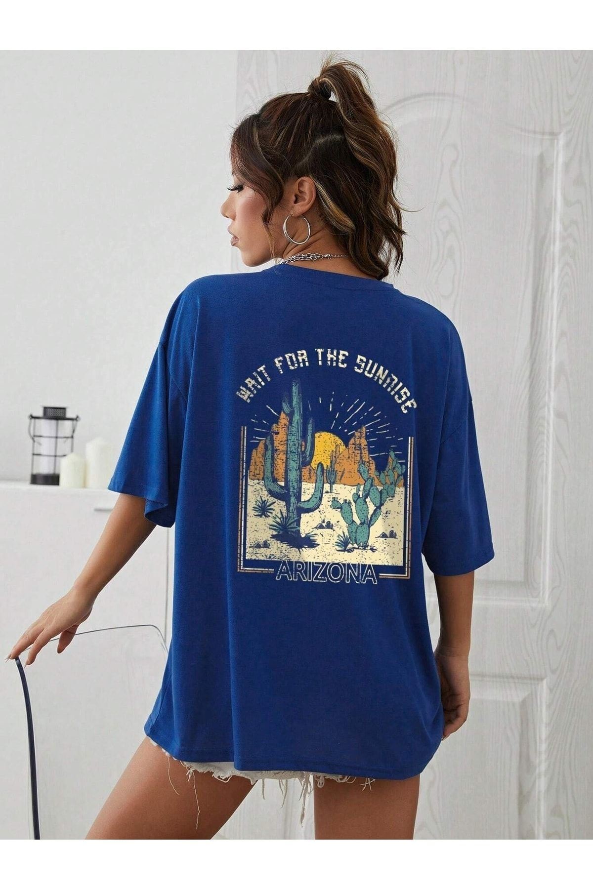 Arizona Sunrise T-shirt - Saks Mavi Oversize Baskılı Bisiklet Yaka