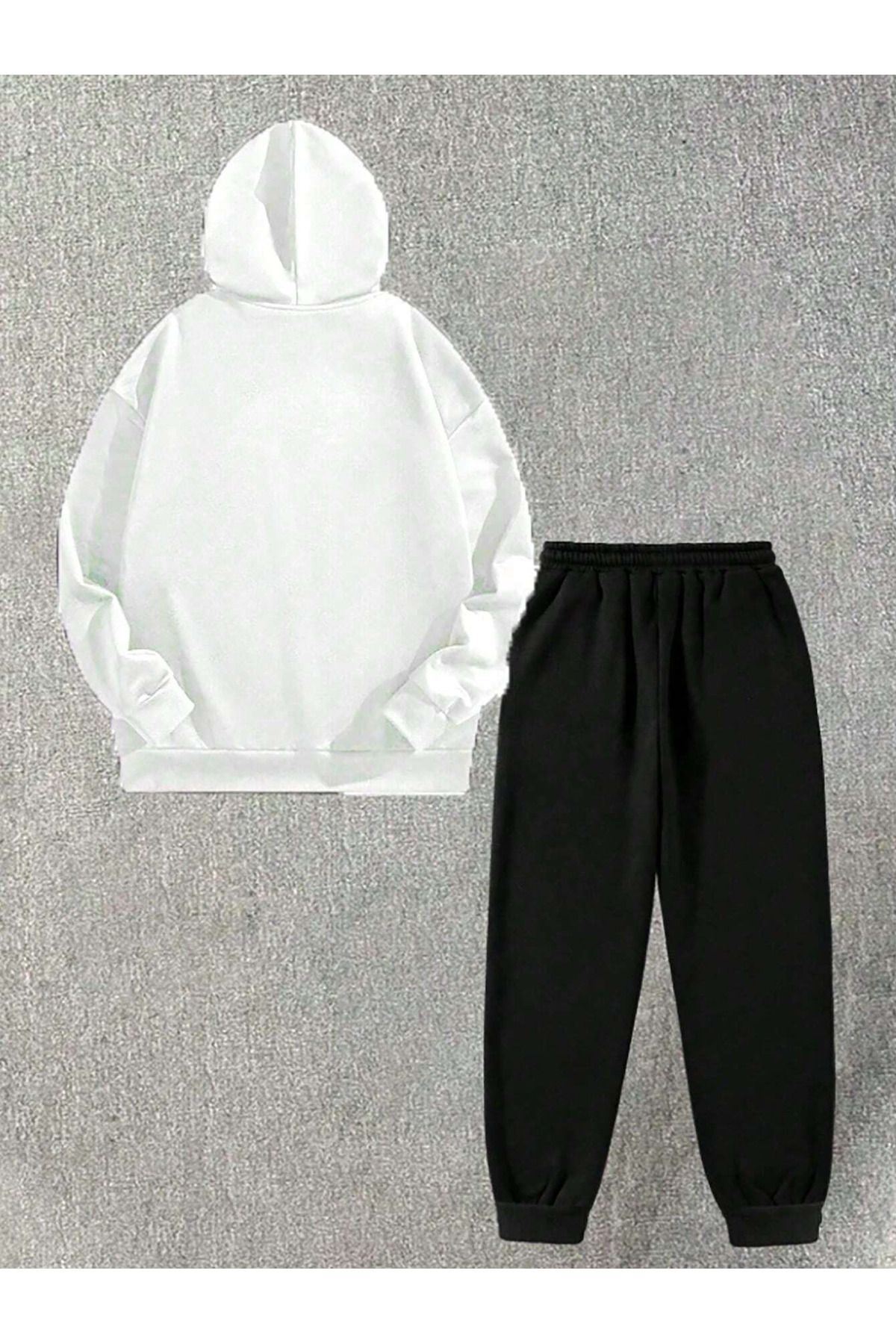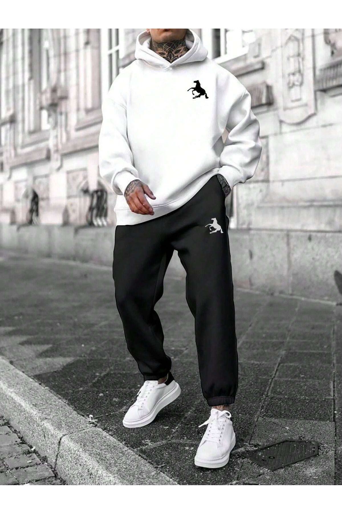 At Baskılı Eşofman Takımı Sweatshirt Jogger - Üst Beyaz Alt Siyah Oversize Şardonlu Kapüşonlu