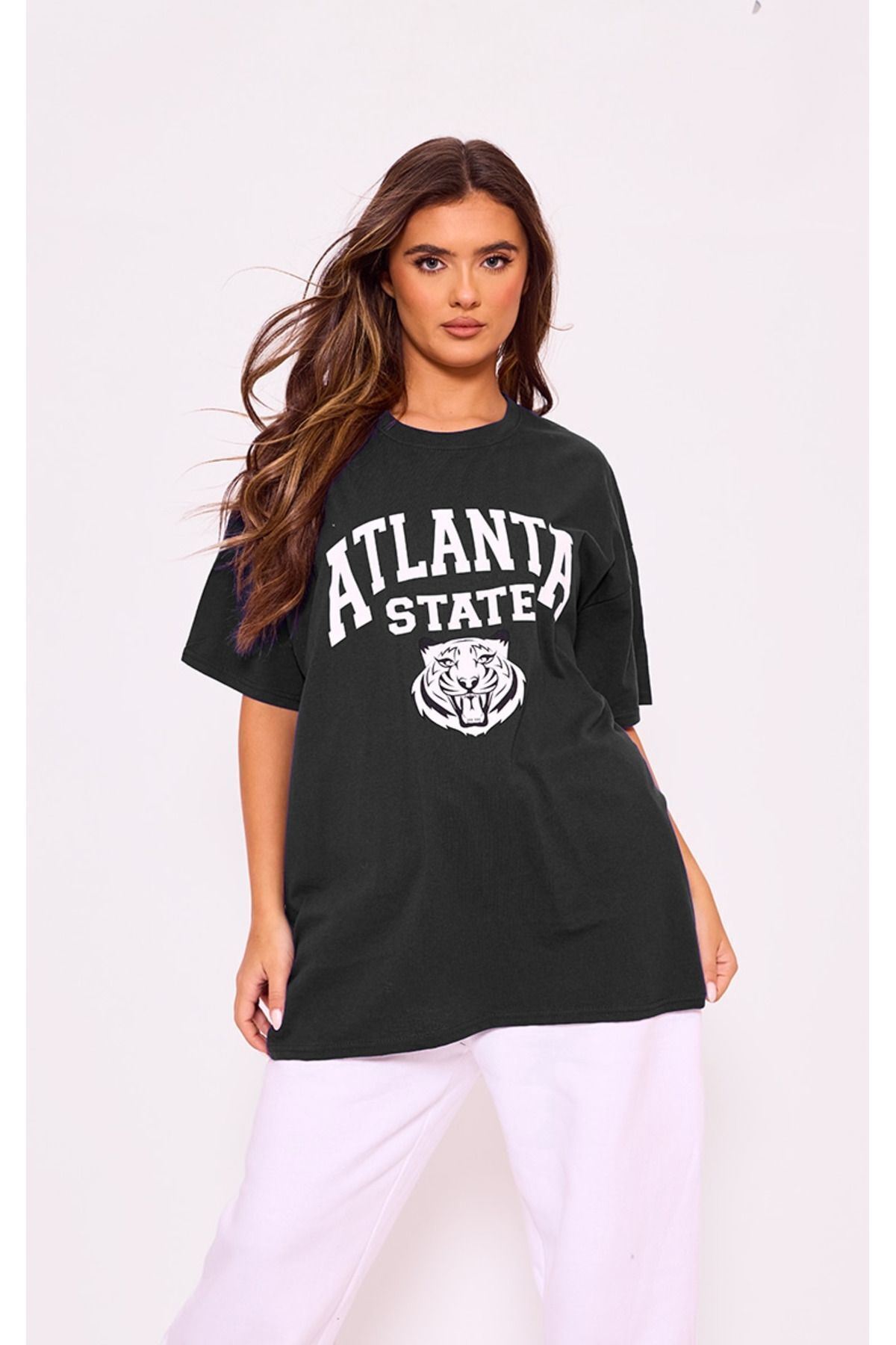 Atlanta State Süprem T-Shirt - Siyah Baskılı Oversize Bisiklet Yaka Kısa Kol Tişört