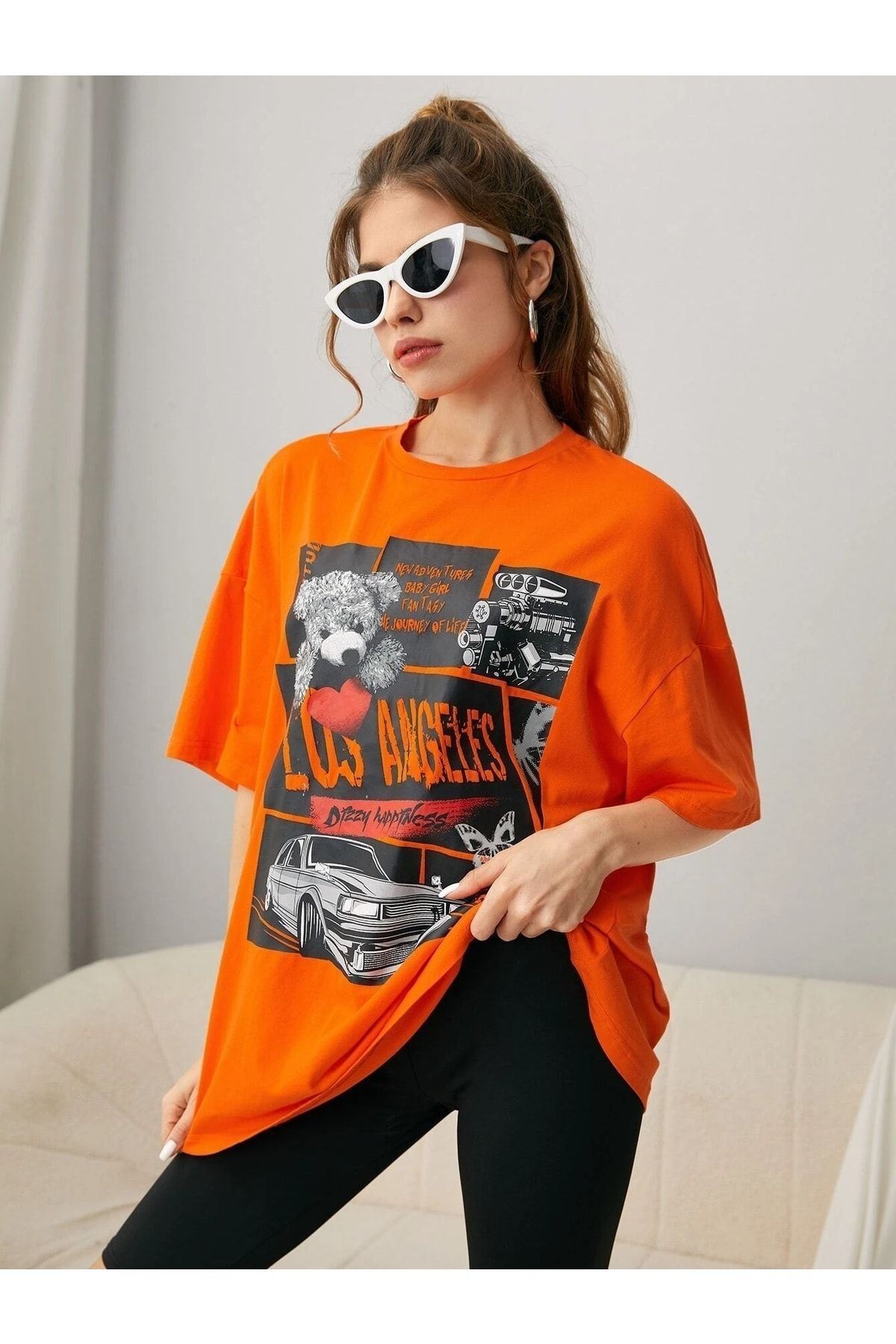 Ayıcık Los Angeles T-shirt - Turuncu Baskılı Oversize Bisiklet Yaka Kısa Kol Tişört