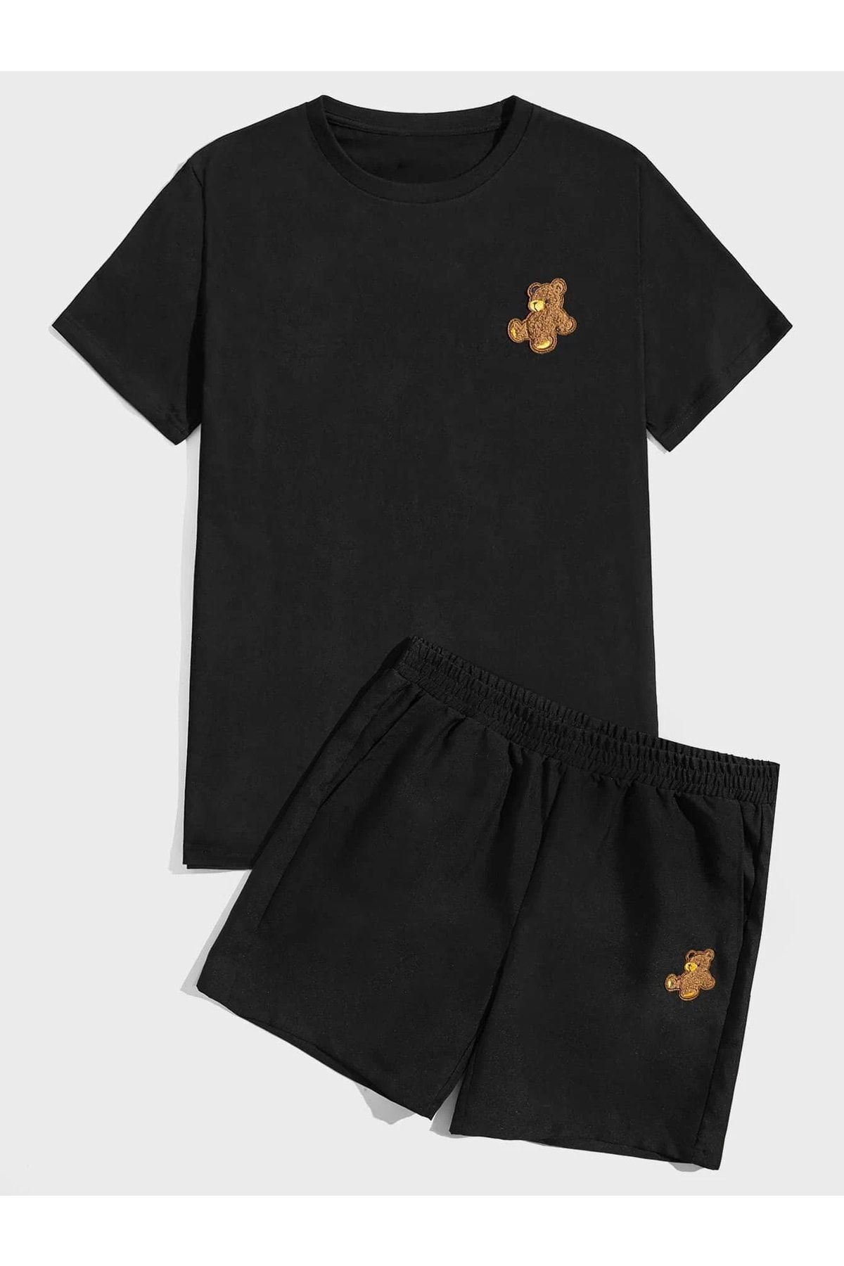 Ayıcık T-Shirt Şort - Siyah Alt Üst Kombin Şort Tişört Takım Baskılı Oversize Bisiklet Yaka