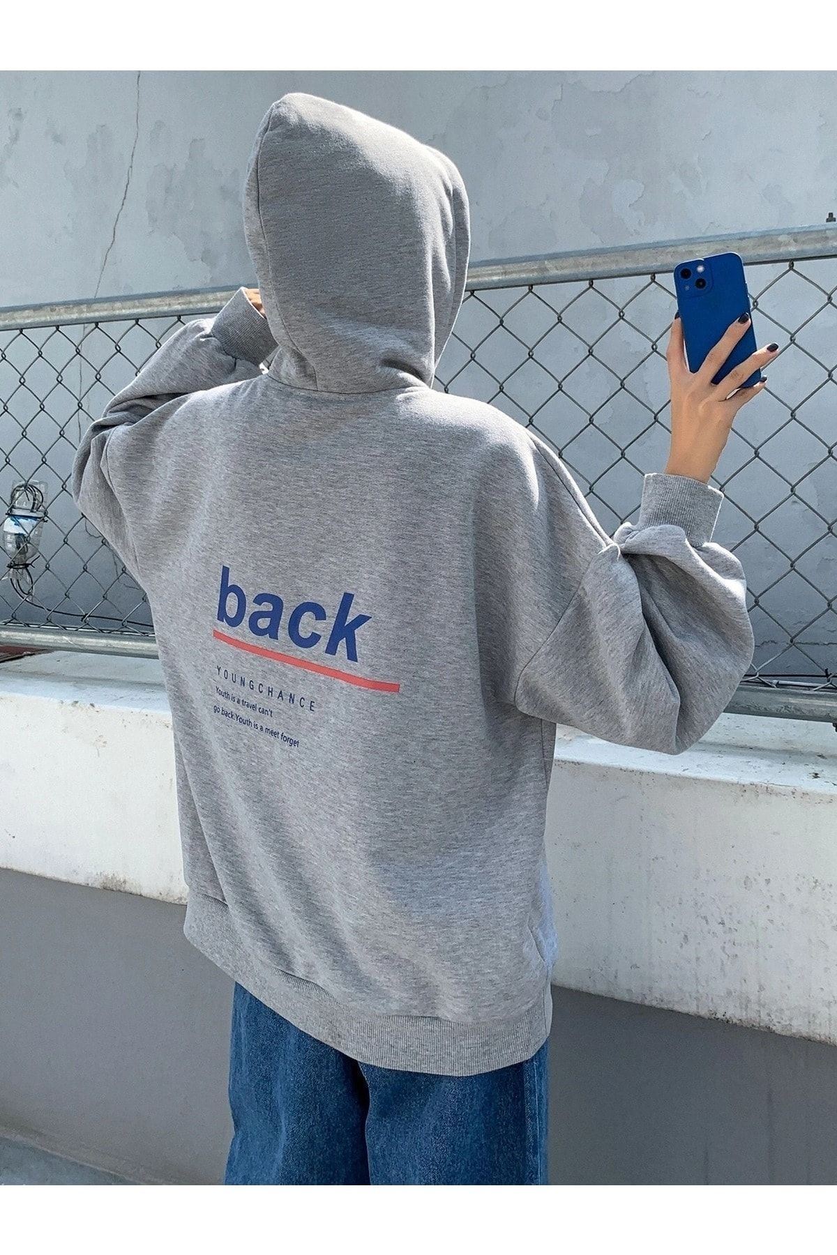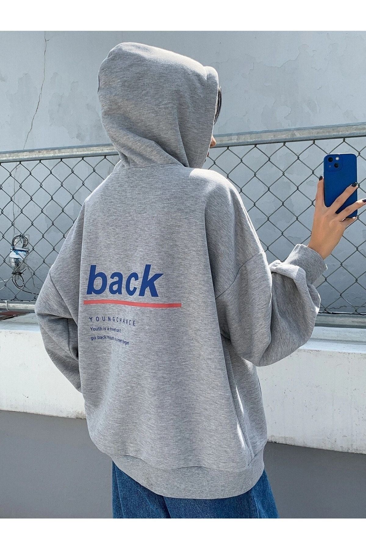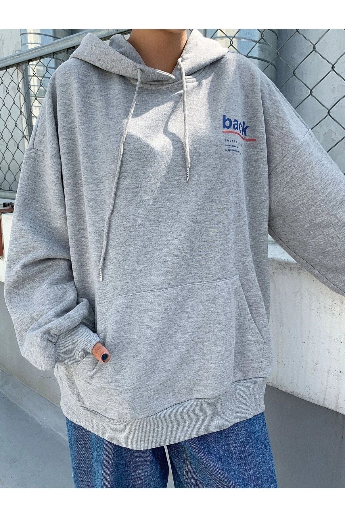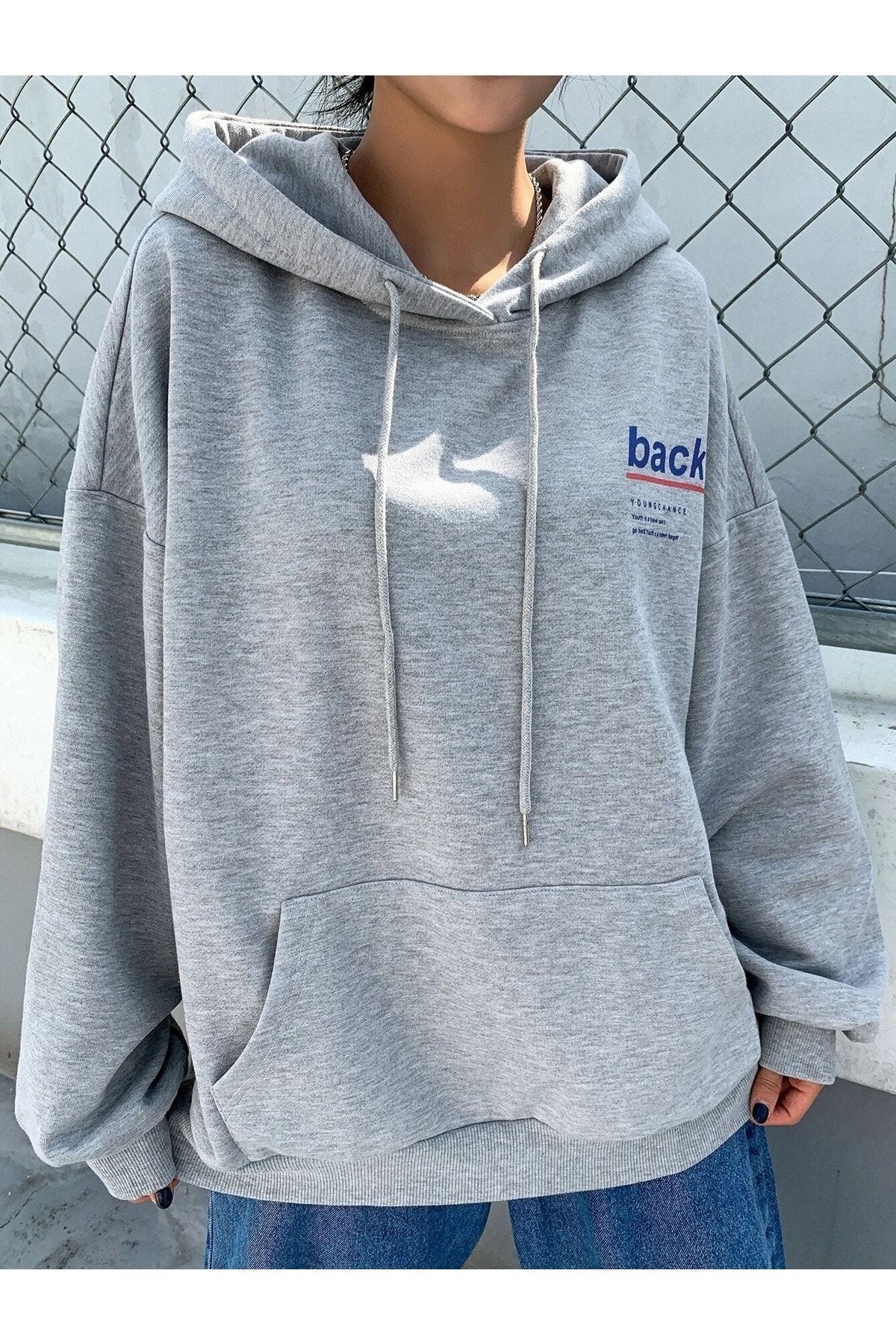 Back Youngchance T-Sweatshirt - Gri Baskılı Oversize Kapüşonlu