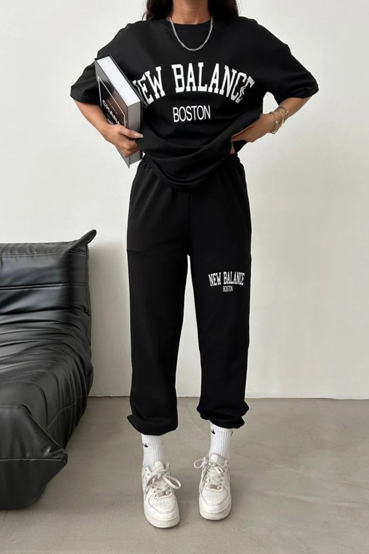 Balance Boston T-shirt Eşofman Altı Jogger- Siyah Baskı Alt Üst Eşofman Takım Oversize Bisiklet Yak