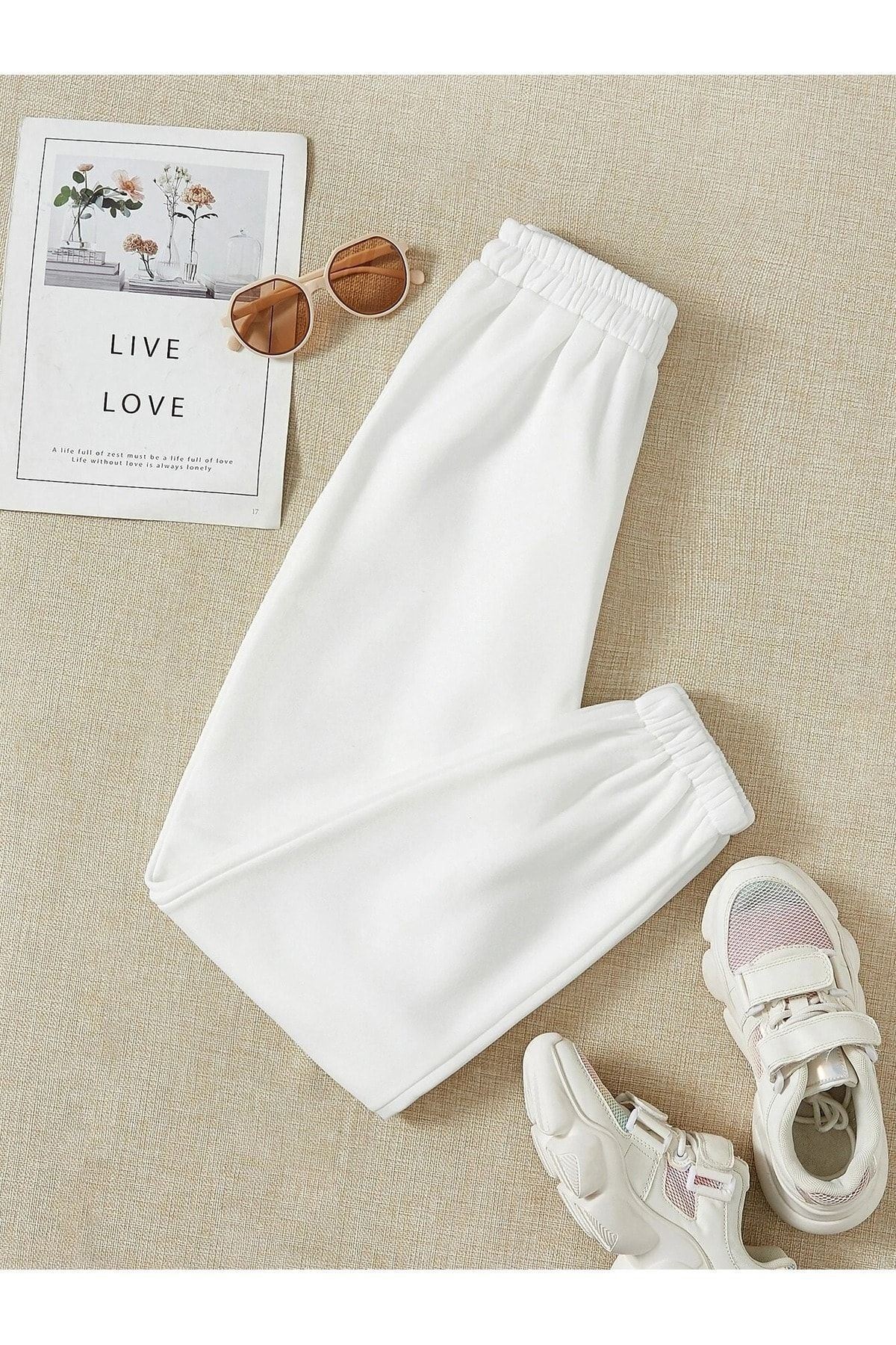 Basic Düz Eşofman Altı Jogger - Beyaz Lastik Paça Yüksek Bel