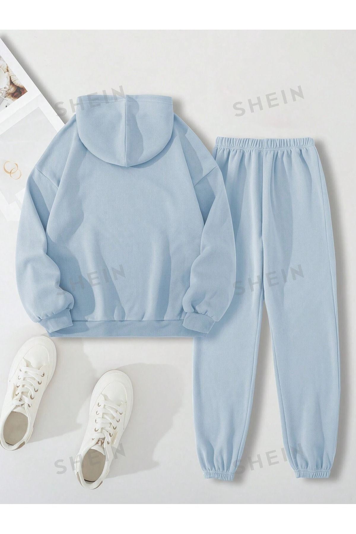 Basic Düz Eşofman Takımı Sweatshirt Jogger - Bebe Mavi Oversize Şardonlu Kapüşonlu