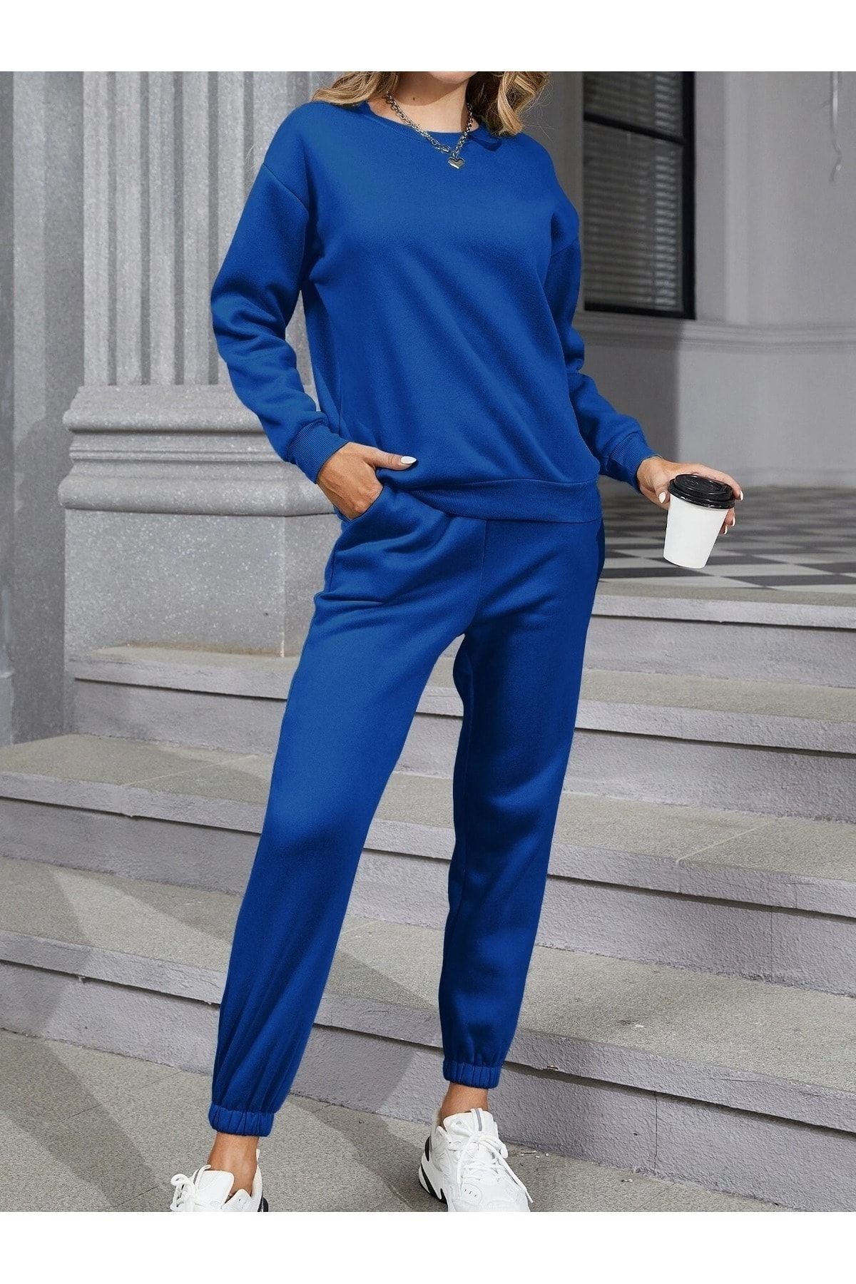 Basic Düz Eşofman Takımı Sweatshirt Jogger - Sax Mavi Oversize Şardonlu Bisiklet Yaka