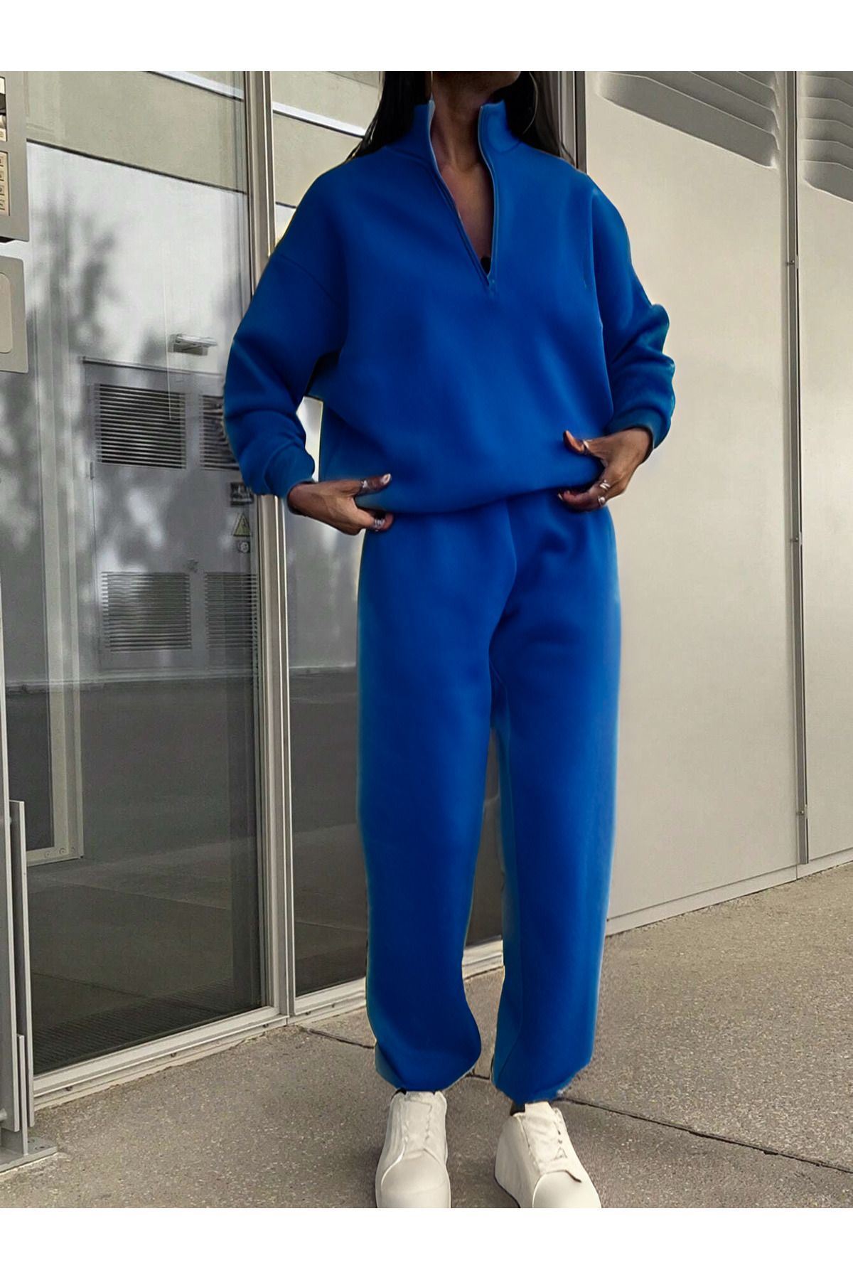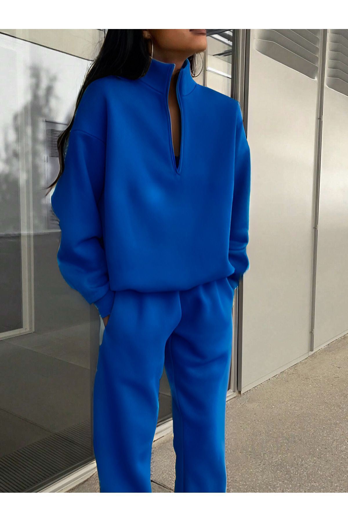 Basic Düz Fermuarlı Eşofman Takımı Sweatshirt Jogger -Sax Mavisi Oversize Şardonlu Dik Yaka