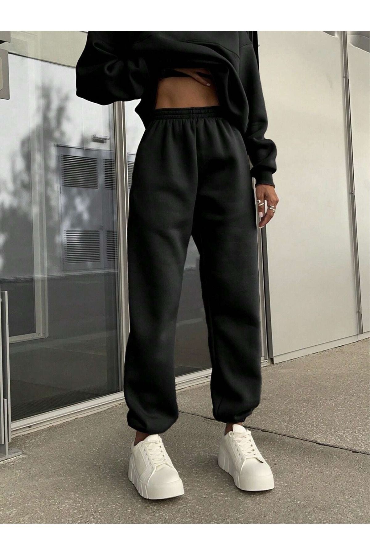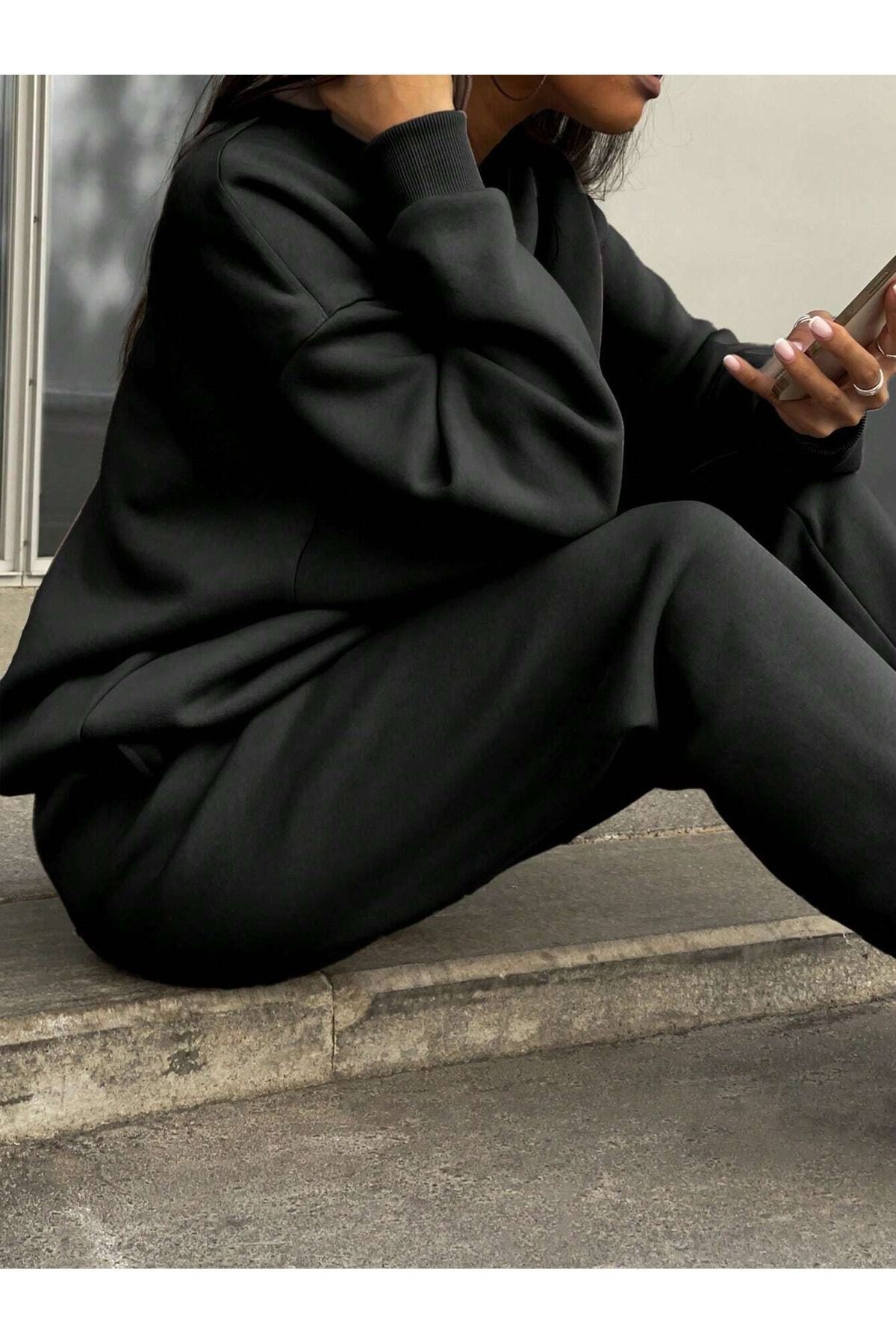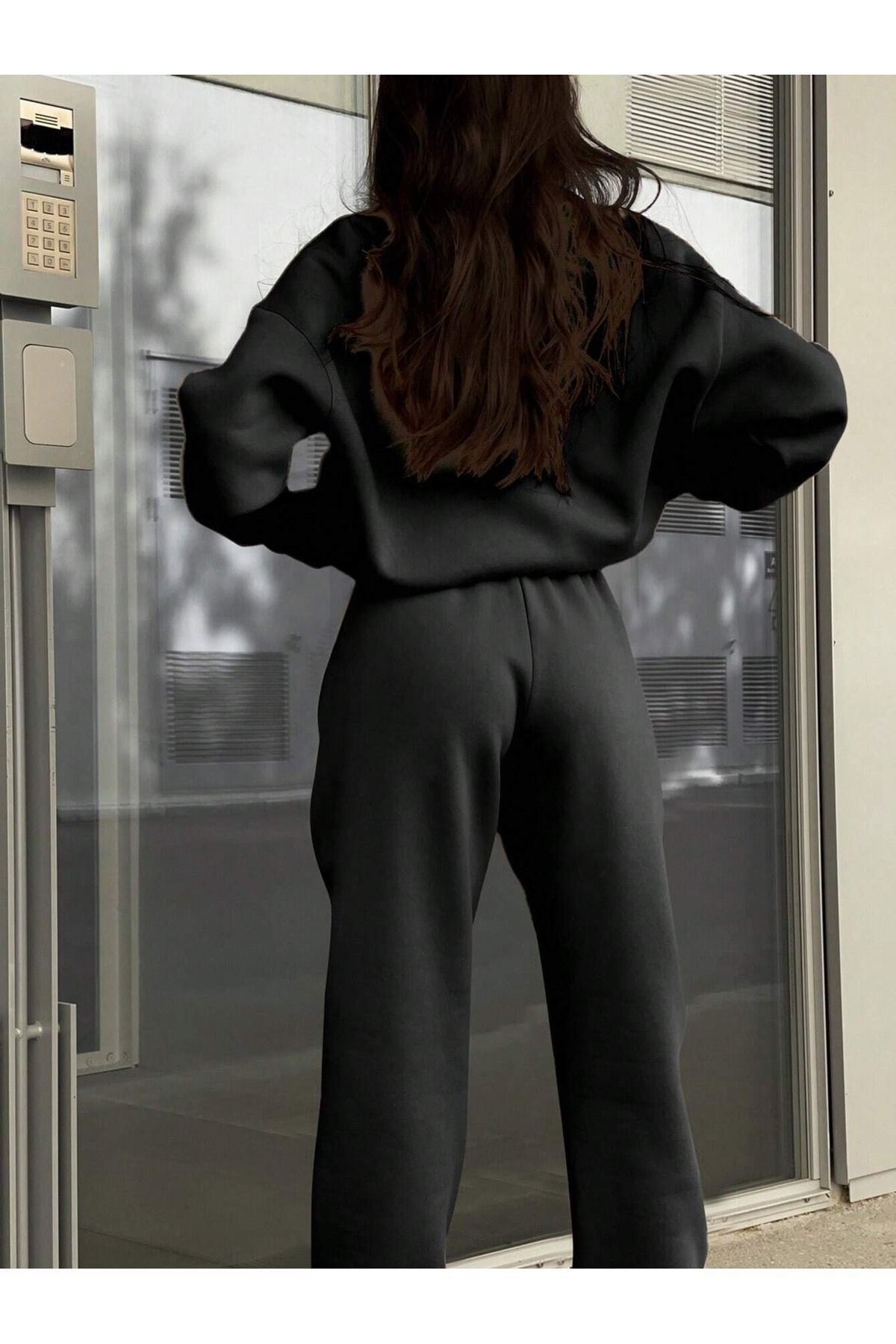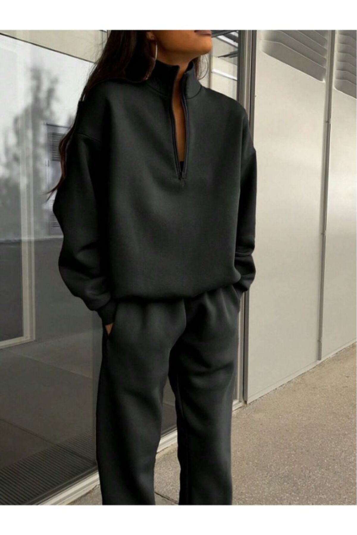 Basic Düz Fermuarlı Eşofman Takımı Sweatshirt Jogger - Siyah Oversize Şardonlu Dik Yaka