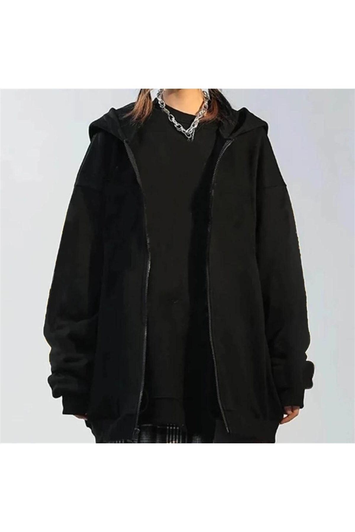 Basic Düz Hırka - Siyah Oversize Kapüşonlu