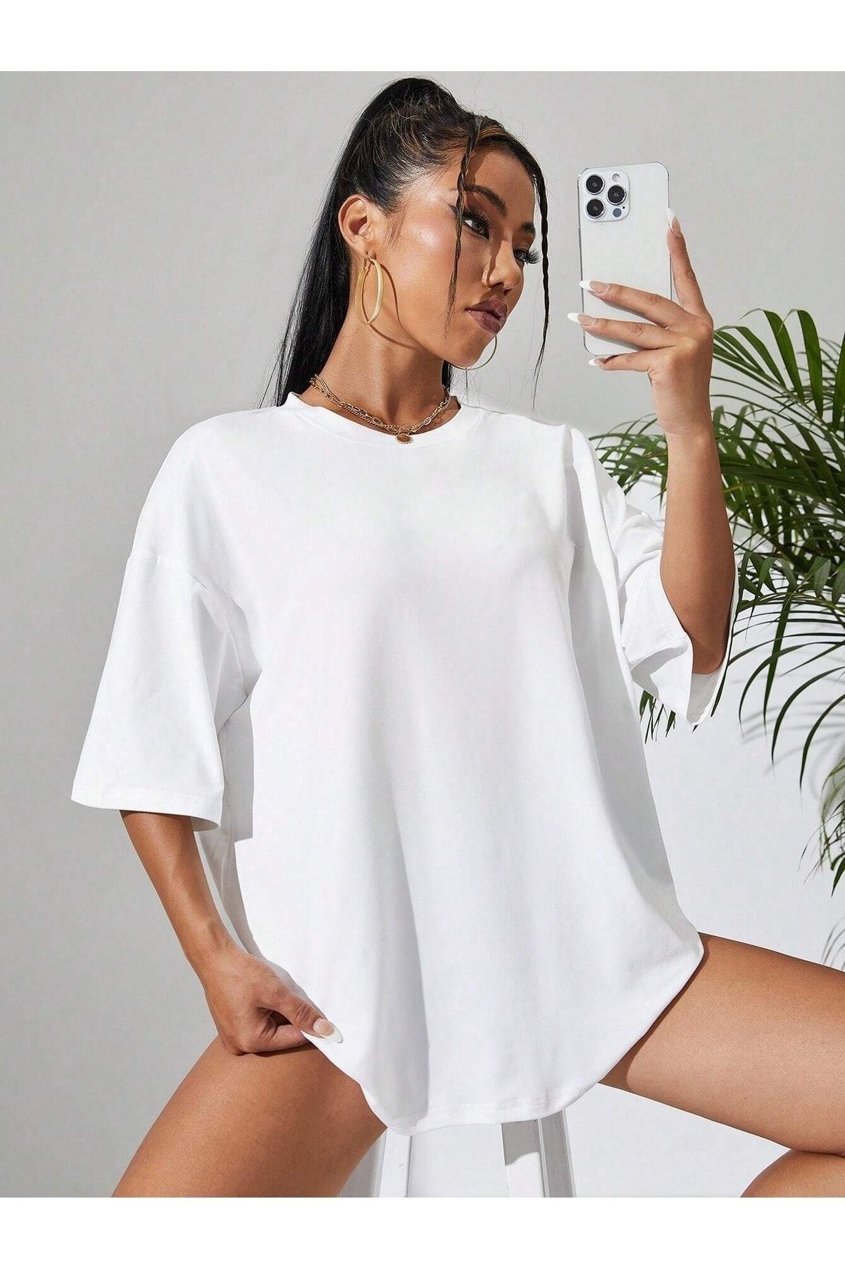 Basic Düz T-Shirt - Beyaz Oversize Bisiklet Yaka Kısa Kol