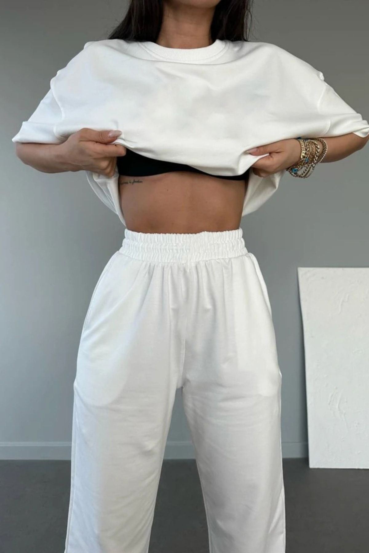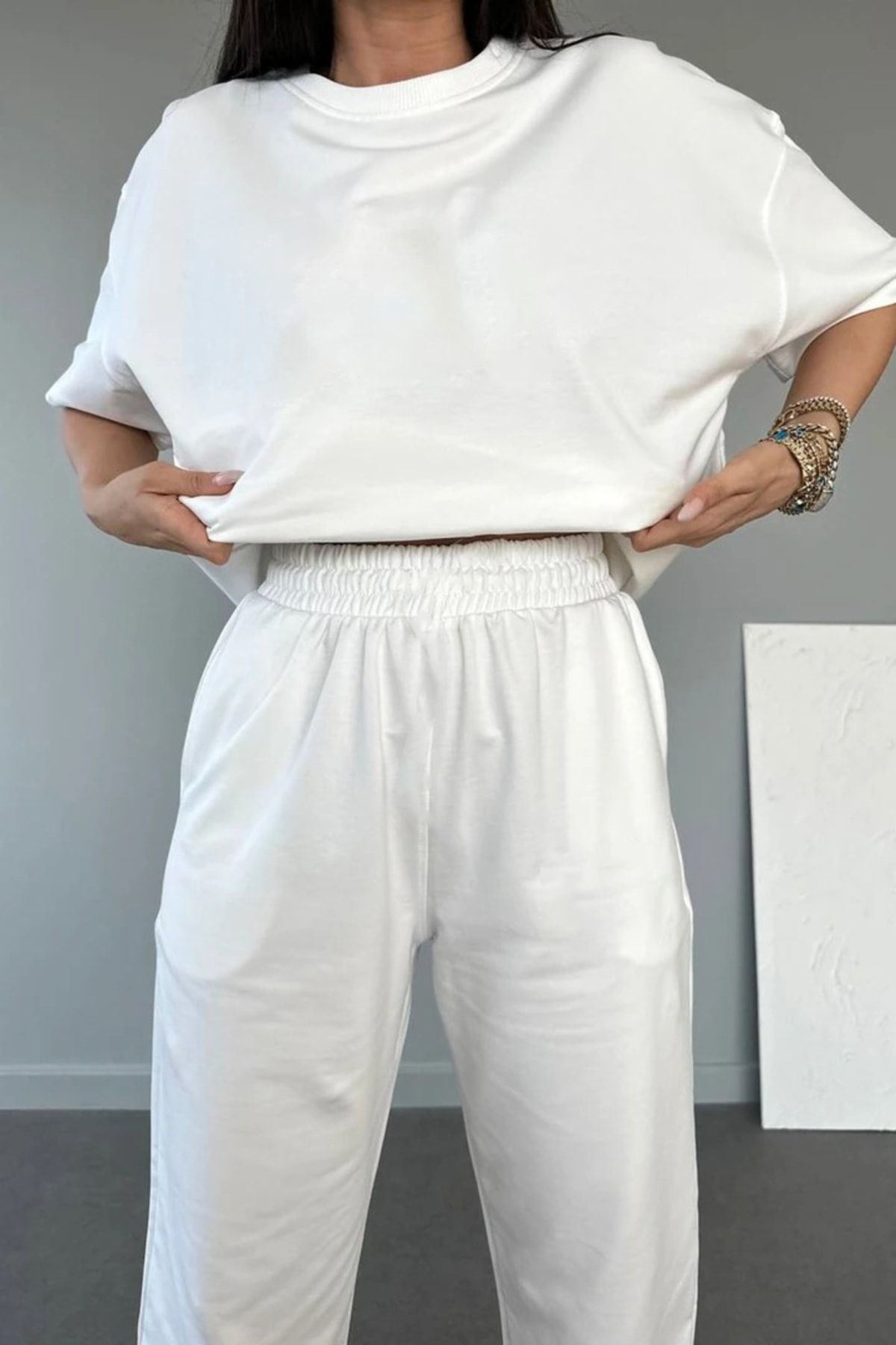 Basic T-shirt Eşofman Altı Jogger - Beyaz Düz Alt Üst Eşofman Takımı Oversize Bisiklet Yaka