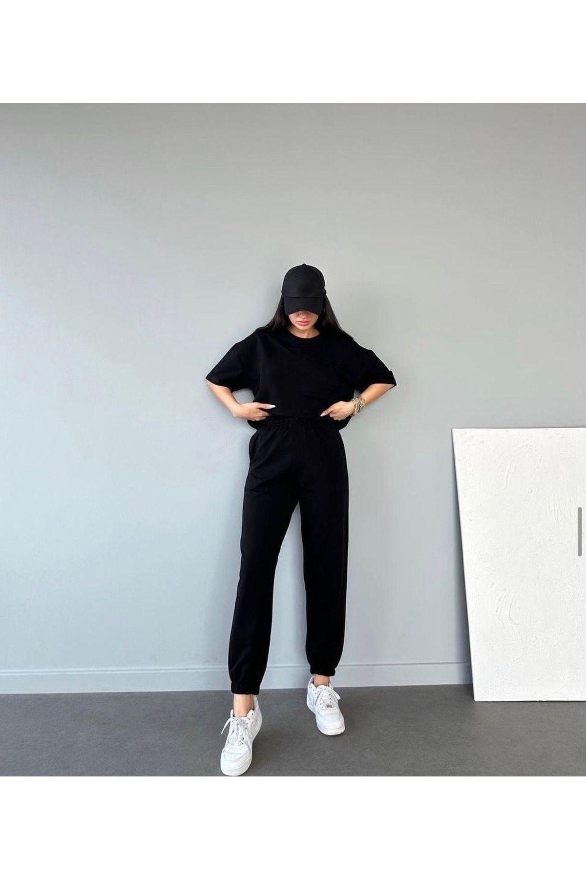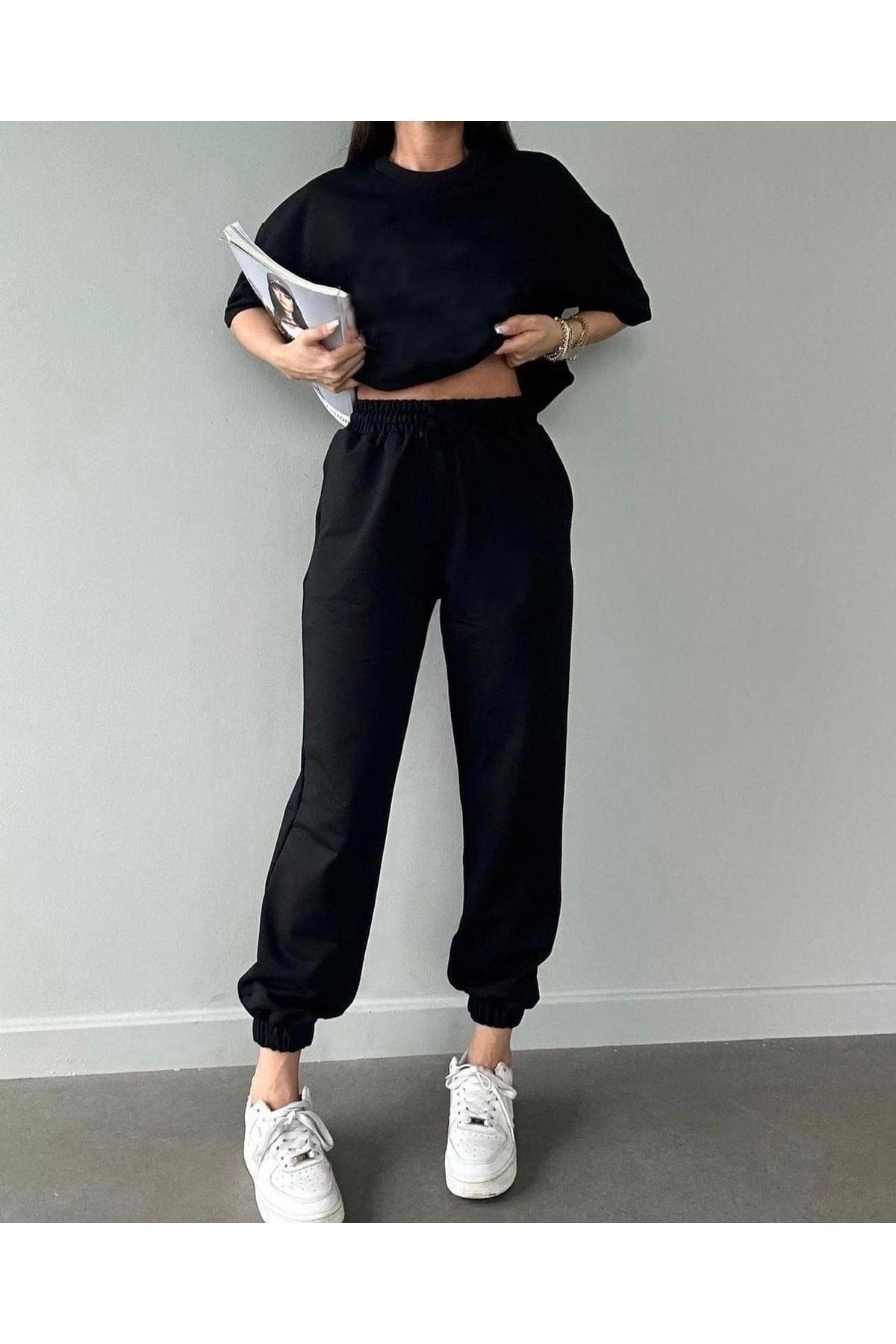 Basic T-shirt Eşofman Altı Jogger - Siyah Düz Alt Üst Eşofman Takımı Oversize Bisiklet Yaka