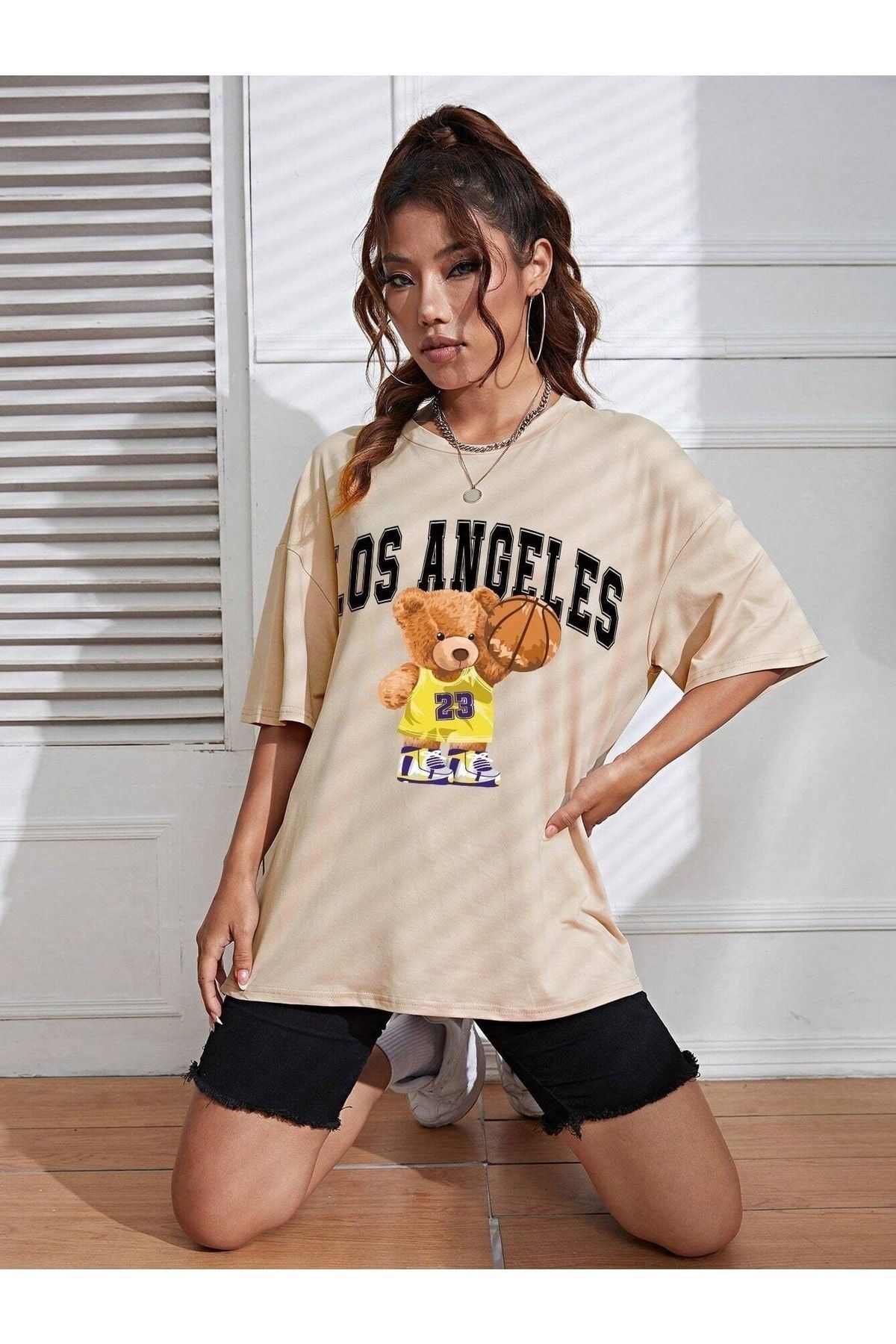 Basketball Bear T-Shirt - Bej Baskılı Oversize Bisiklet Yaka Kısa Kol