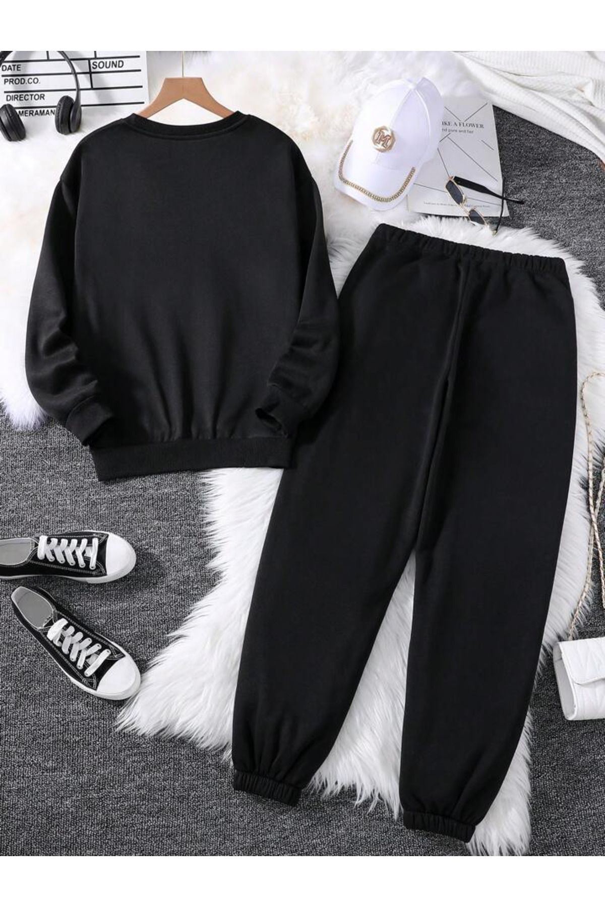 Baskısız Düz Eşofman Takımı Sweatshirt Jogger - Syah Oversize Şardonlu Bisiklet Yaka