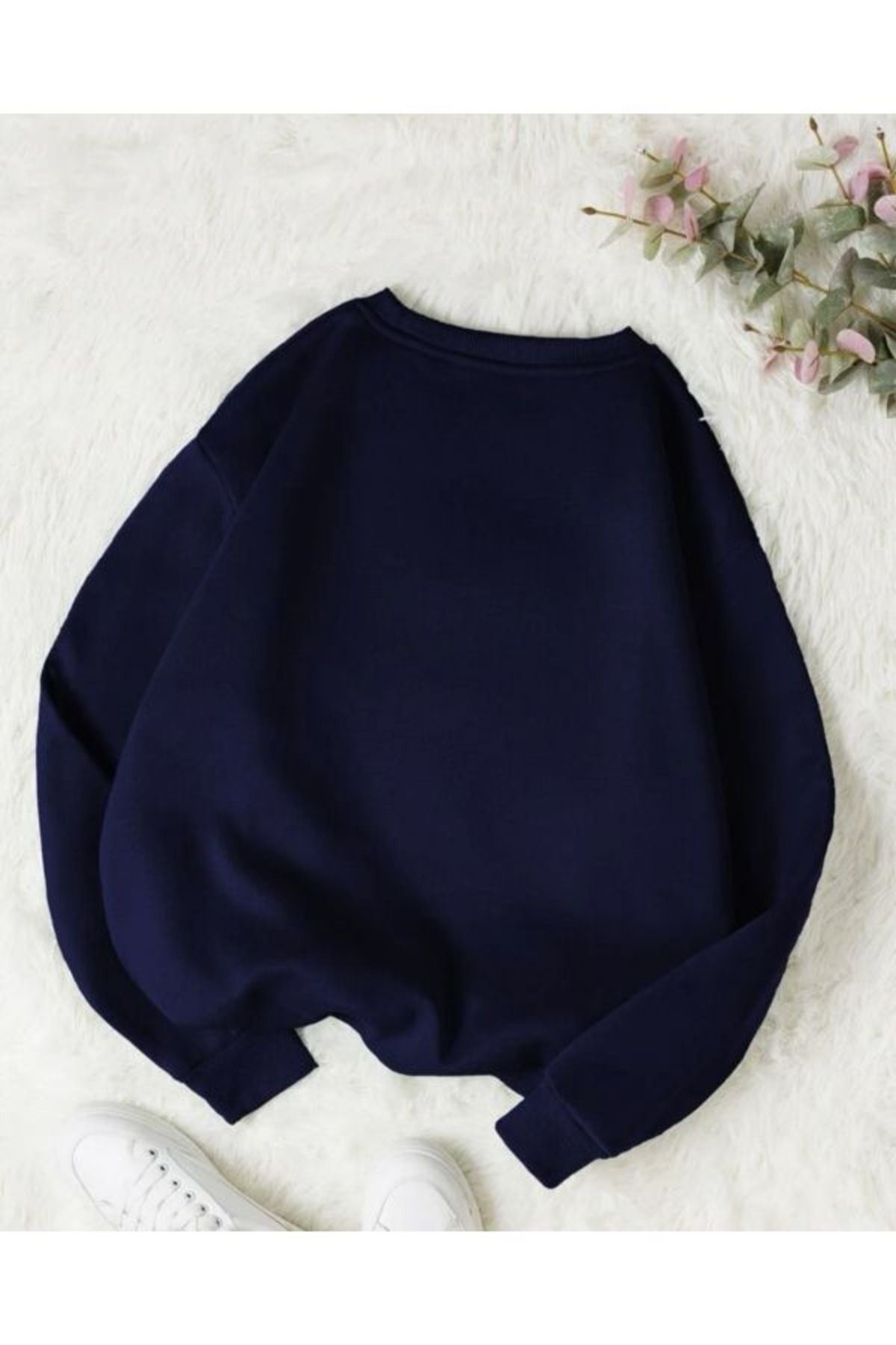 Baskısız Düz Sweatshirt - Lacivert Kalın Kışlık Şardonlu Uzun Kol Oversize Bisiklet Yaka
