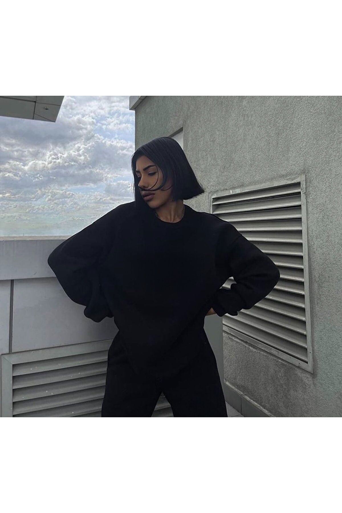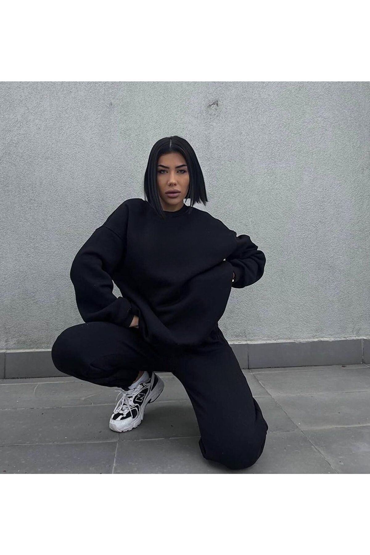 Baskısız Eşofman Takımı Sweatshirt Jogger - Siyah Oversize Şardonlu Bisiklet Yaka
