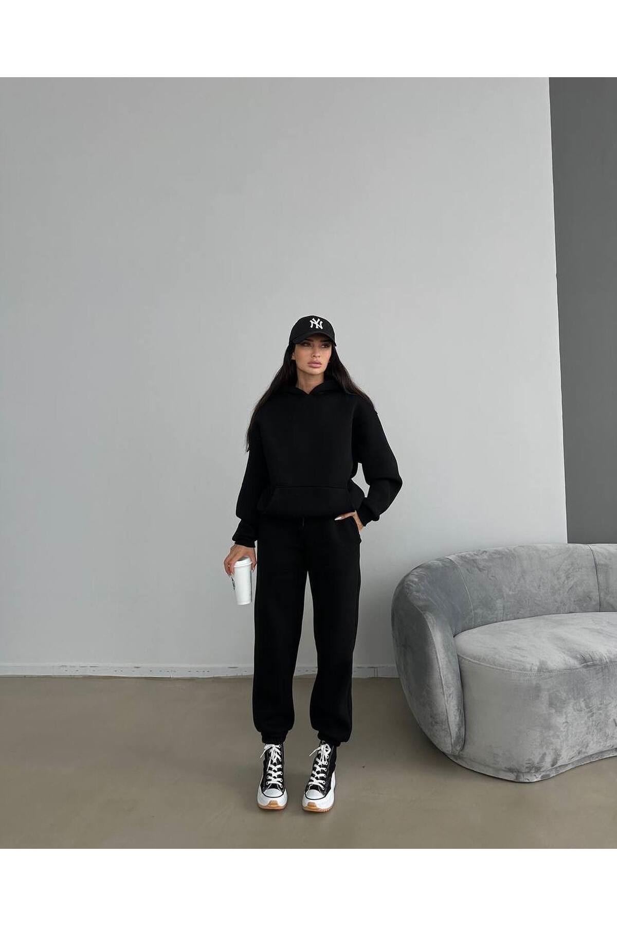 Baskısız Eşofman Takımı Sweatshirt Jogger - Siyah Oversize Şardonlu Kapüşonlu