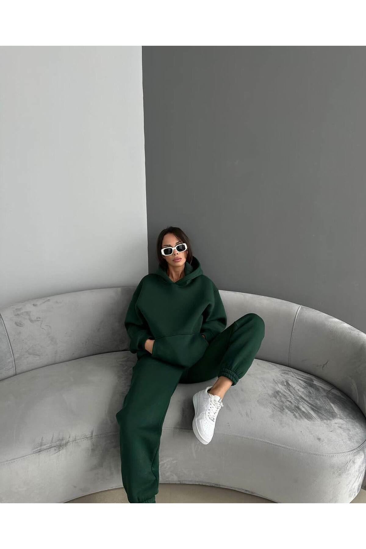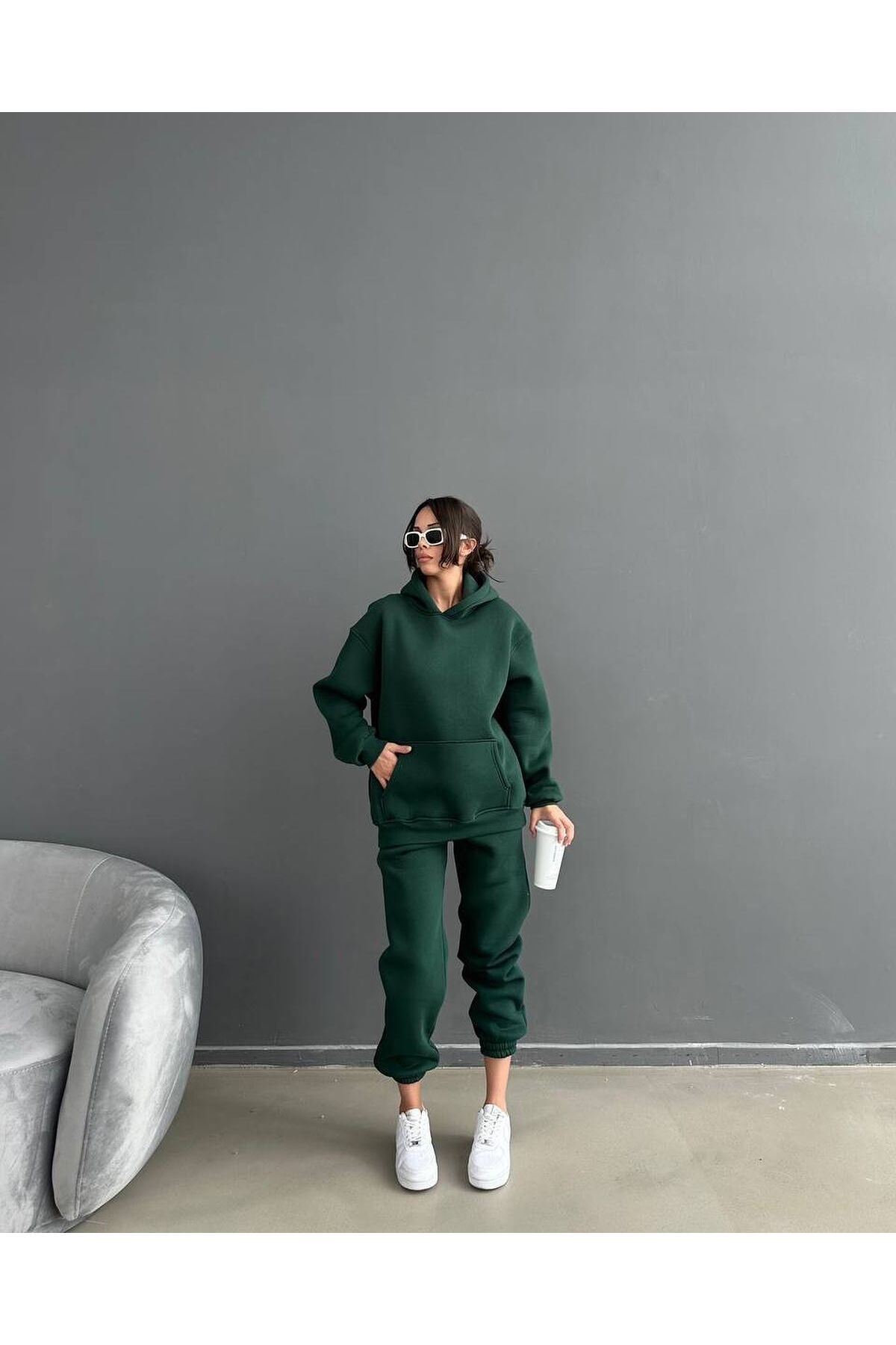 Baskısız Eşofman Takımı Sweatshirt Jogger - Yeşil Oversize Şardonlu Kapüşonlu