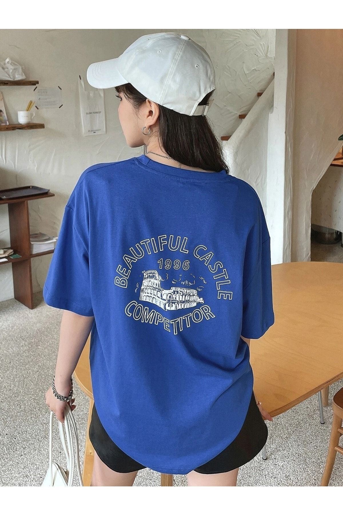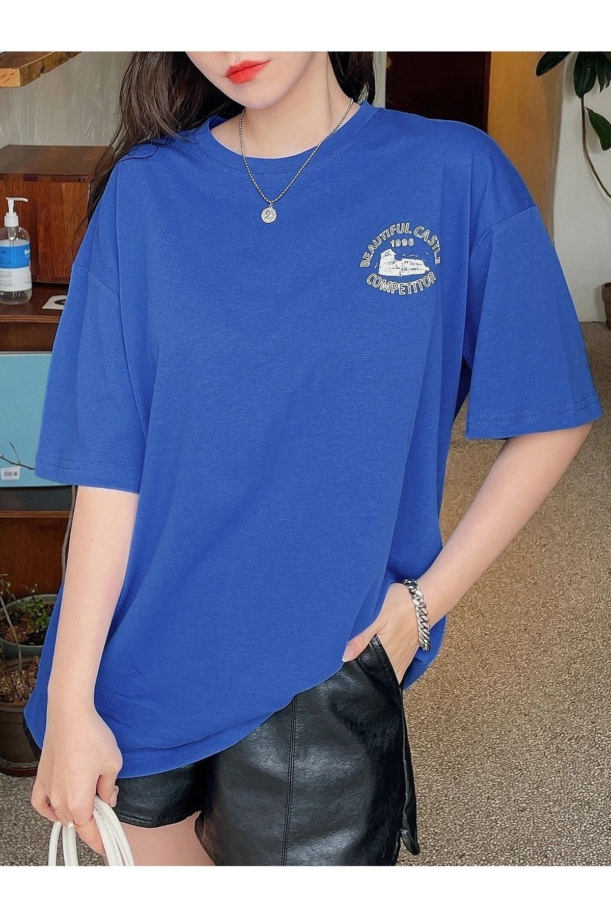 Beatiful Castle T-Shirt - Sax Mavi Baskılı Oversize Bisiklet Yaka Kısa Kol