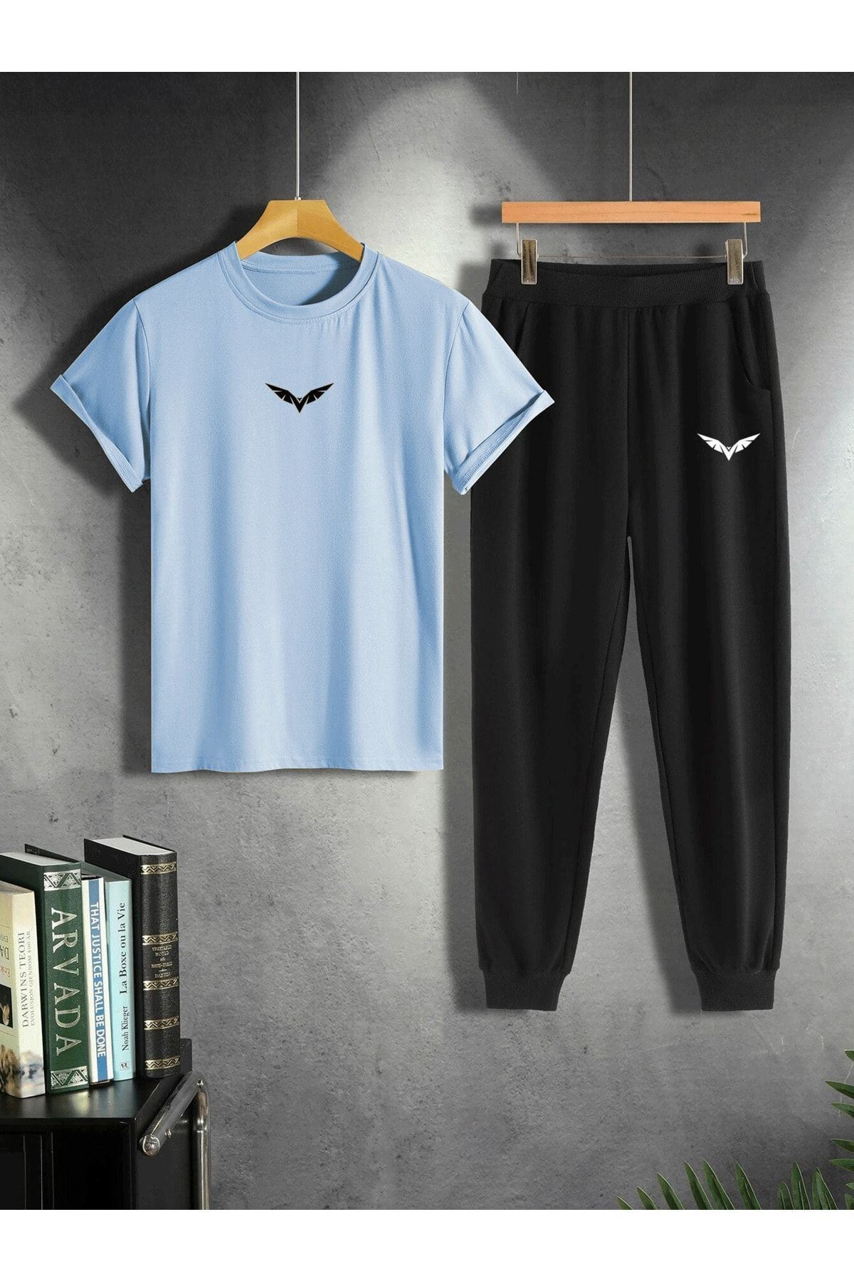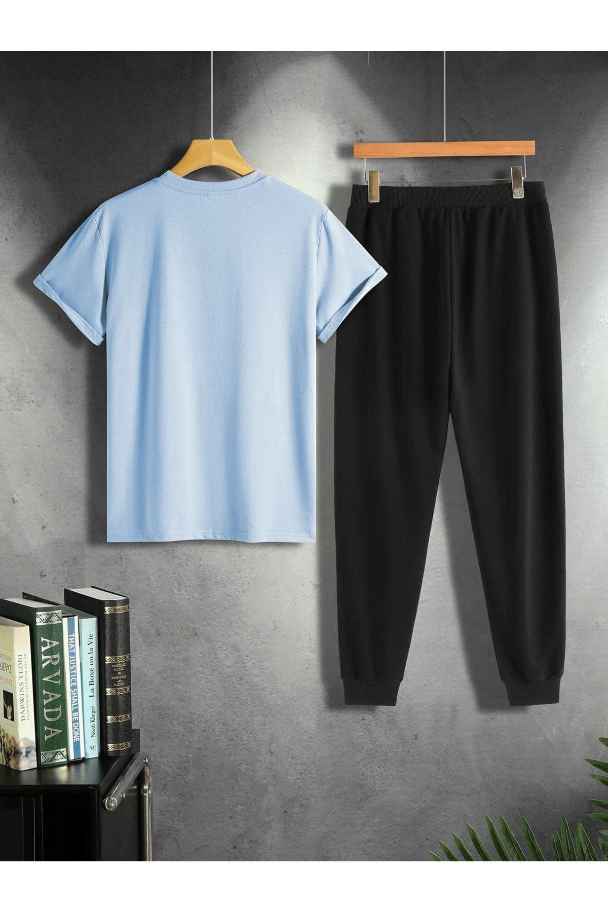 Bebe Mavi T-Shirt Siyah Eşofman Altı Jogger - Baskılı Alt Üst Takım Oversize Bisiklet Yaka