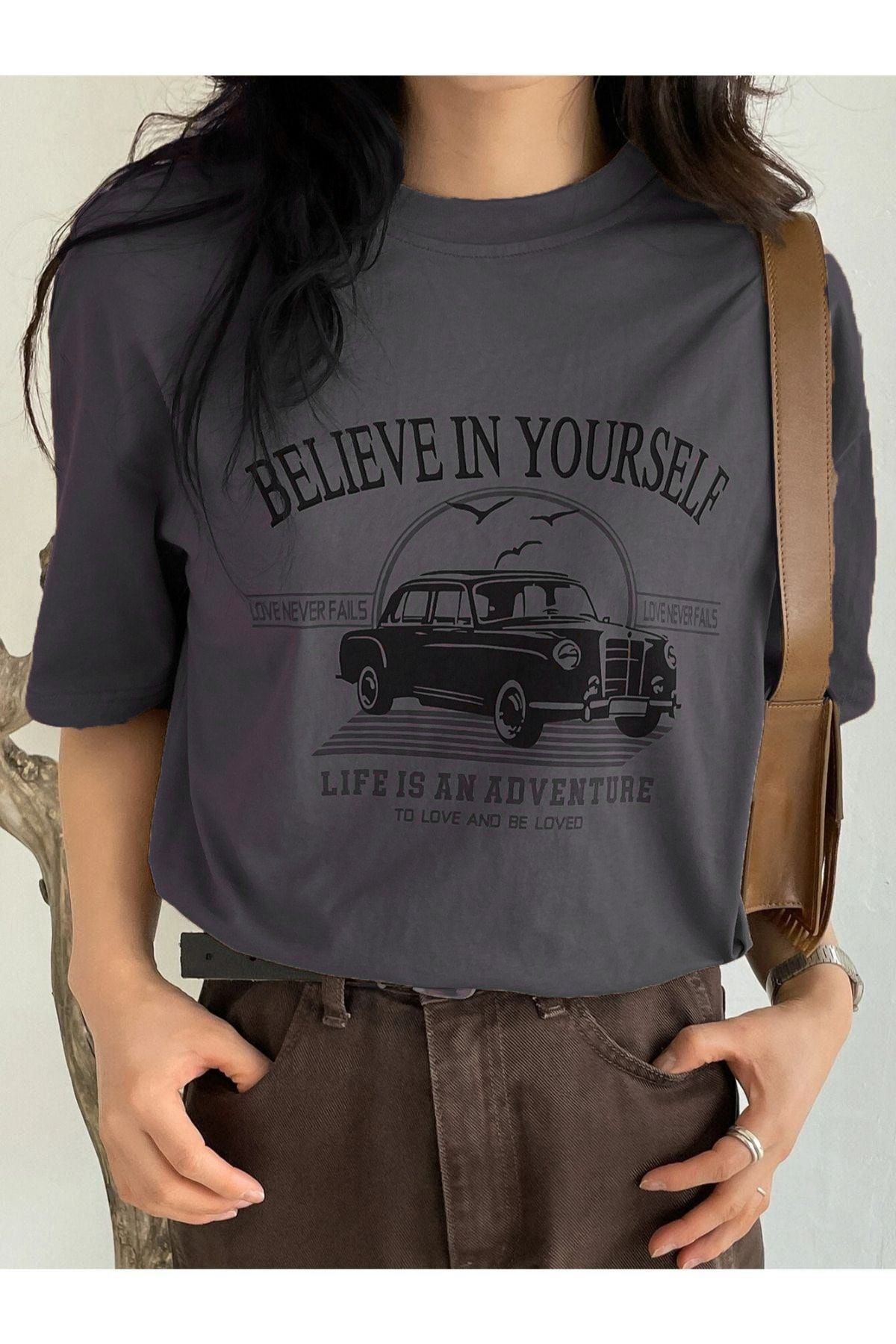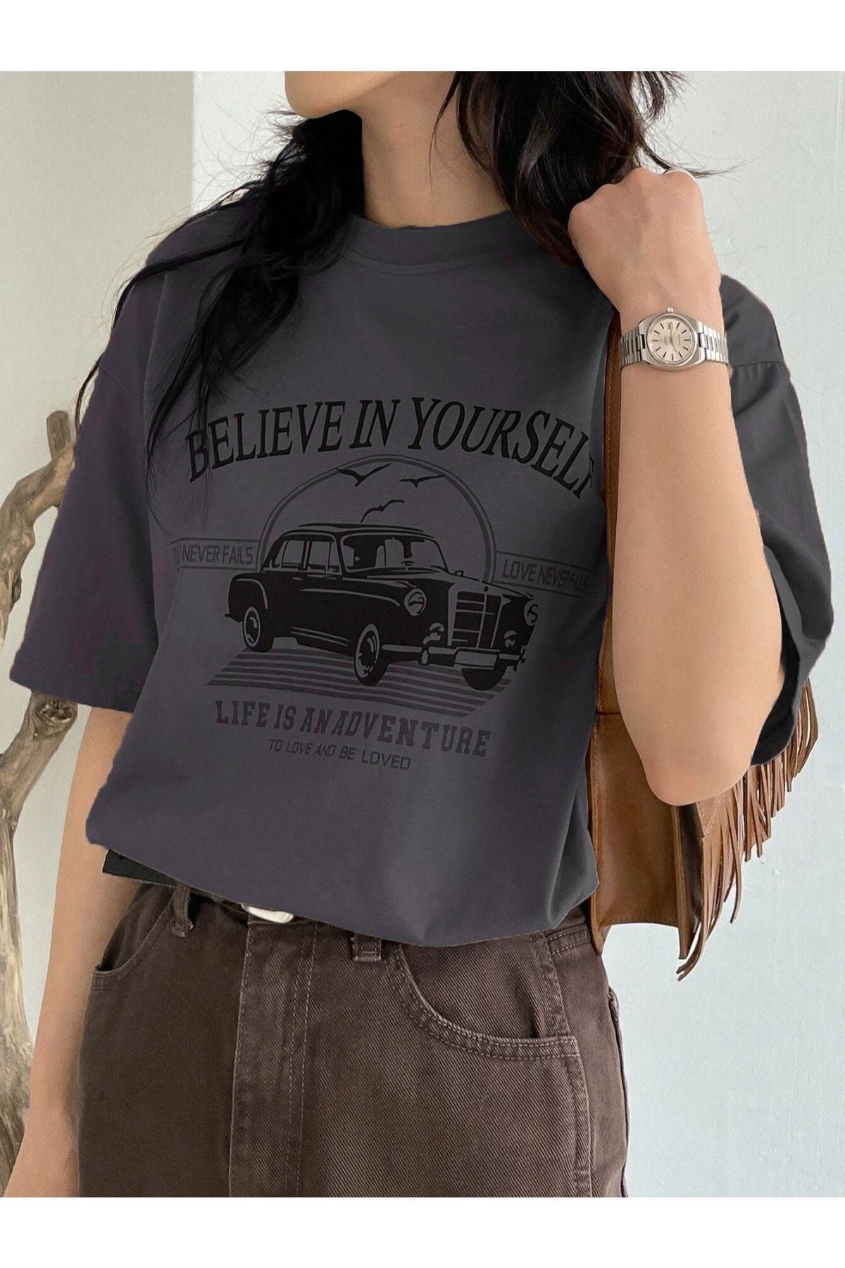 Believe In Yourself T-shirt - Füme Baskılı Oversize Bisiklet Yaka Kısa Kol Tişört
