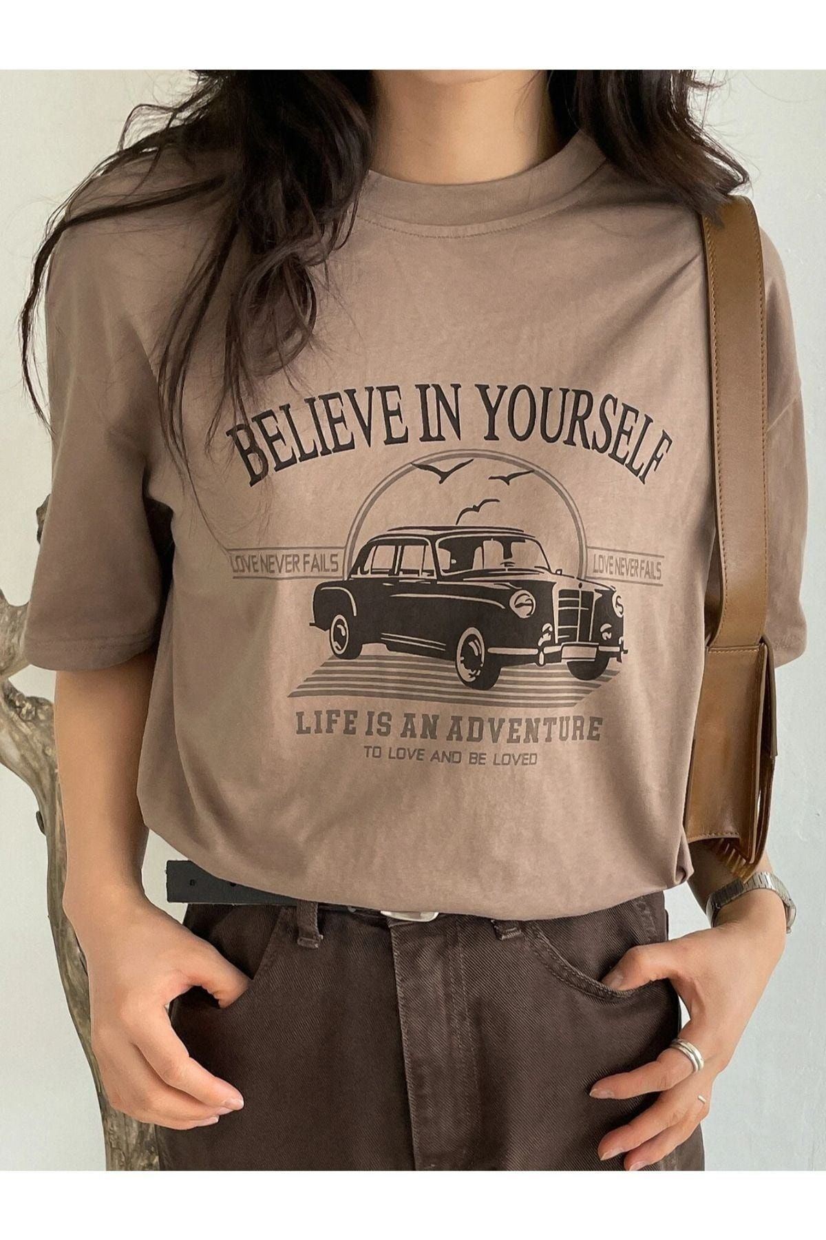 Believe In Yourself T-shirt - Vizon Baskılı Oversize Bisiklet Yaka Kısa Kol Tişört