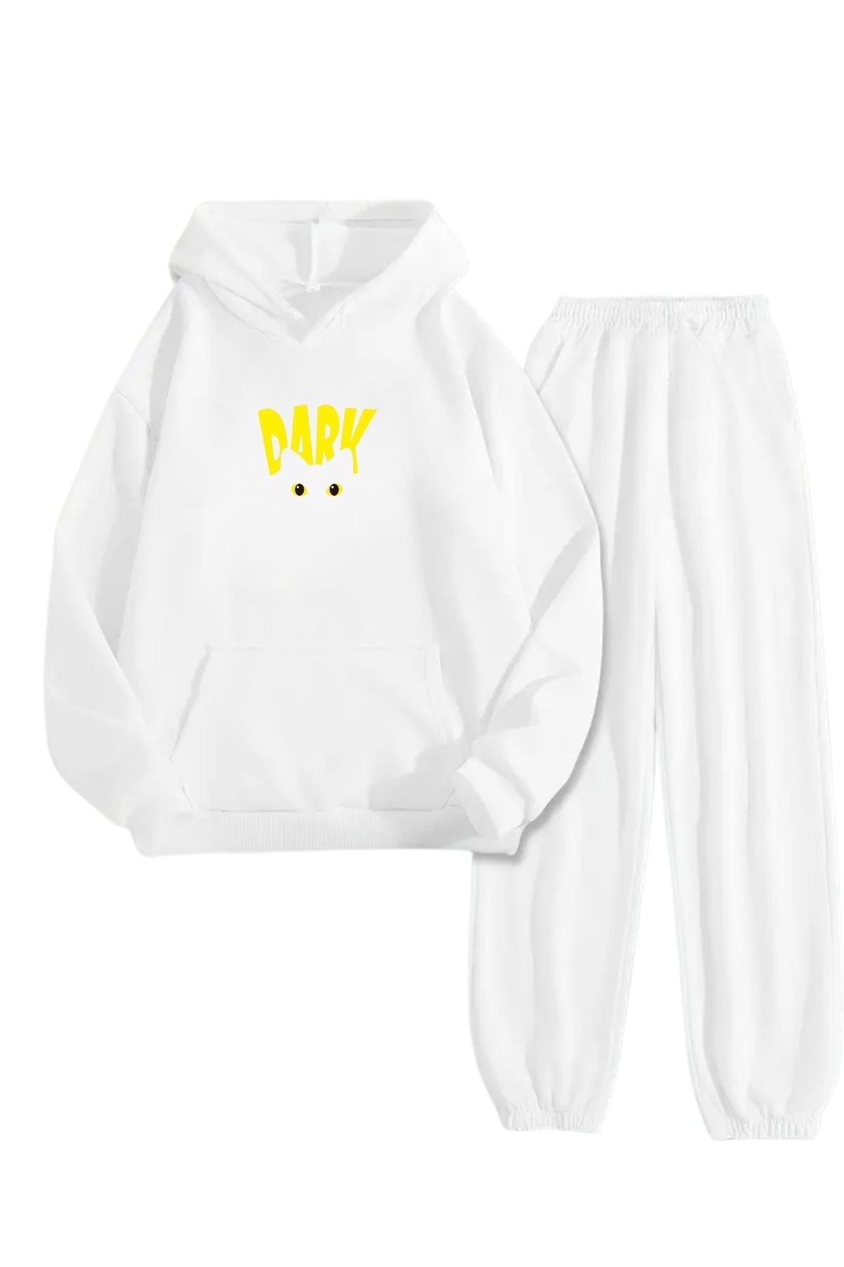 Beyaz Eşofman Takımı – Dark Cat Baskılı, Kapüşonlu Sweatshirt ve Jogger Pantolon