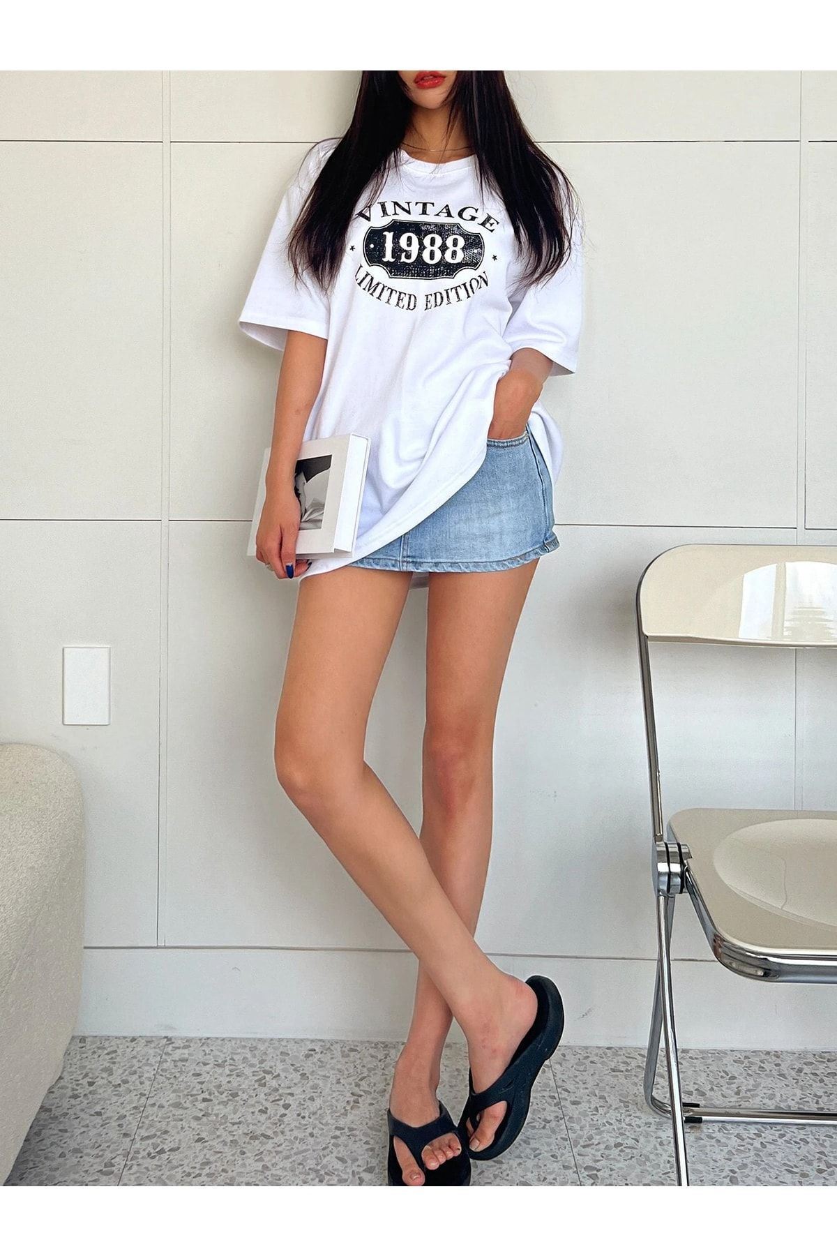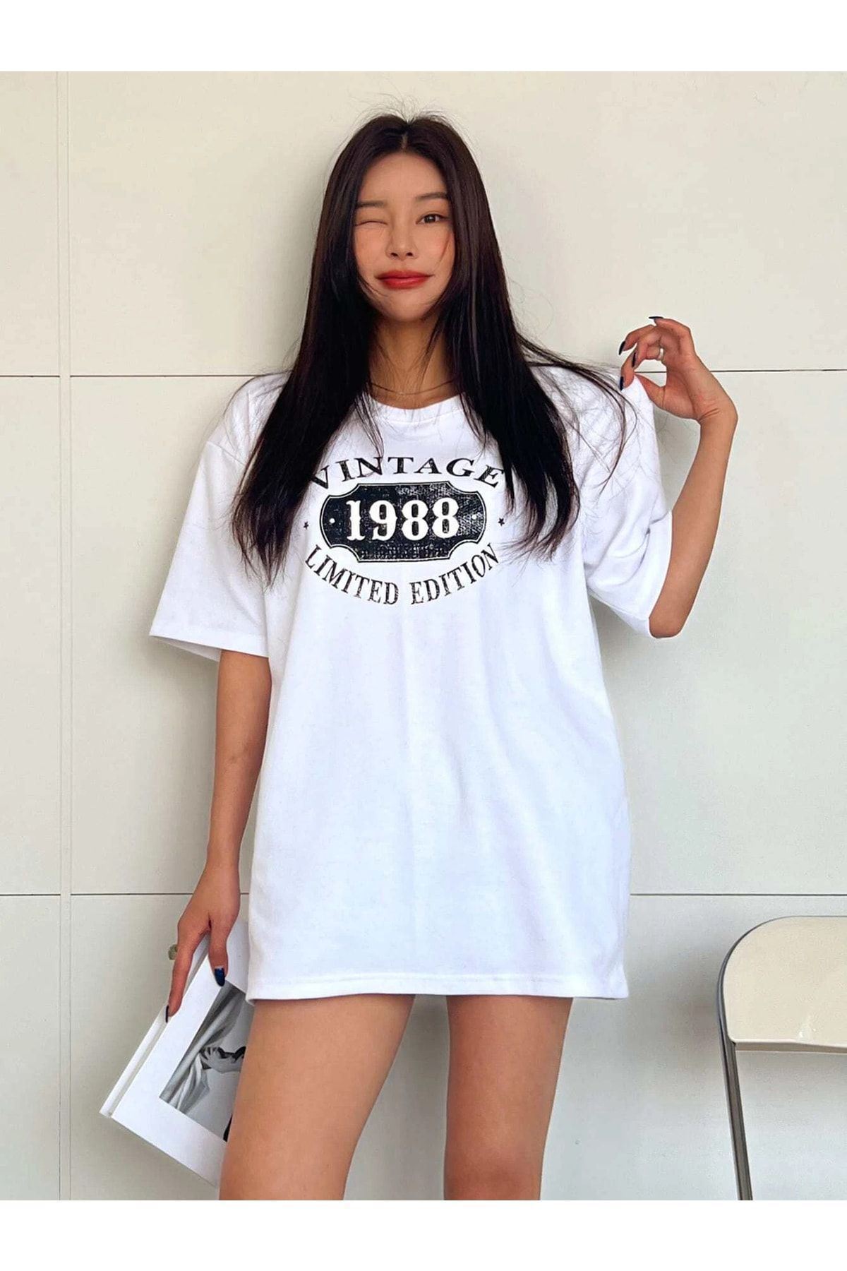 Beyaz Oversize Vintage Baskılı T-shirt - Oversize Baskılı