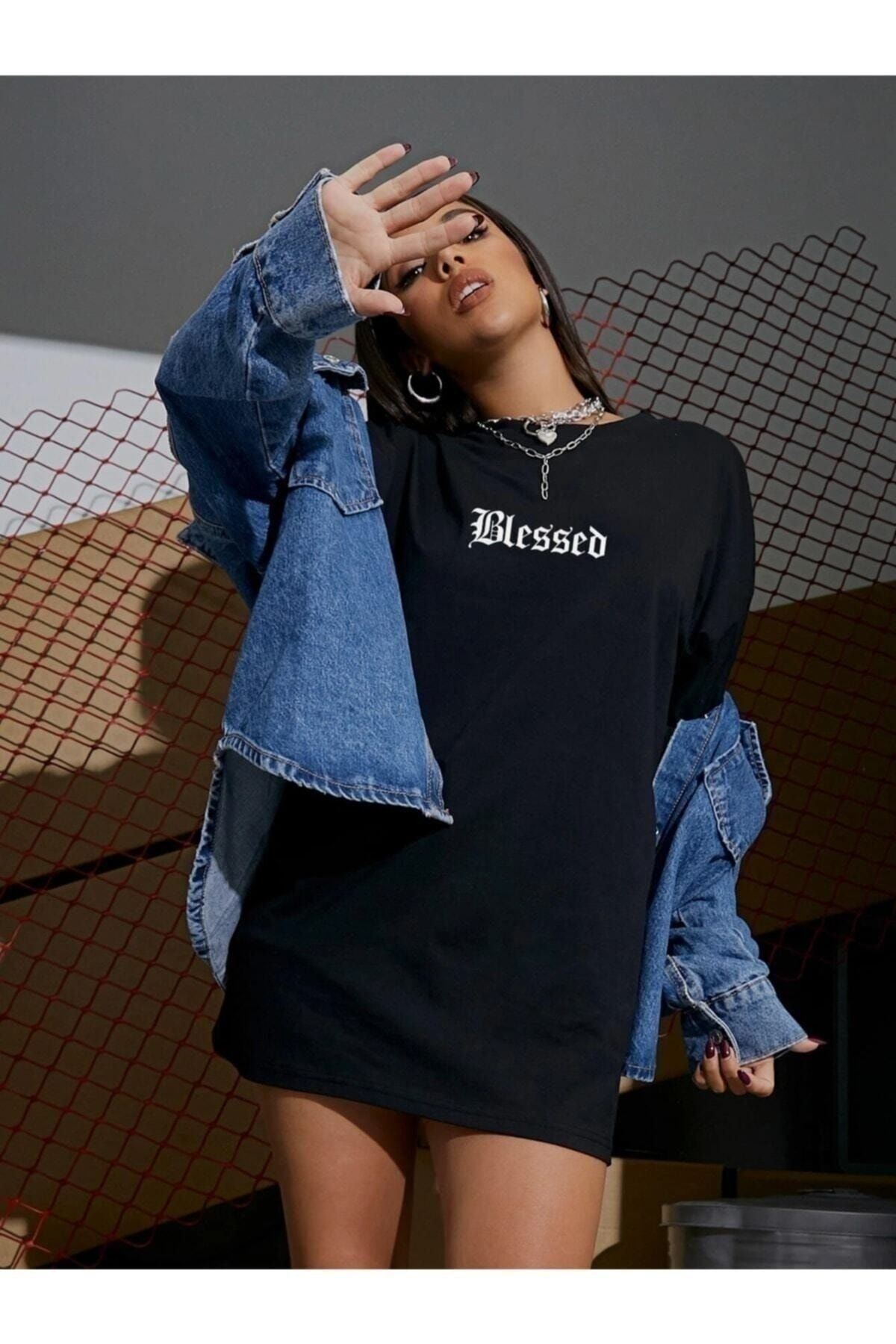 Blessed Özel Tasarım T-Shirt - Siyah Baskılı Oversize Bisiklet Yaka Kısa Kol